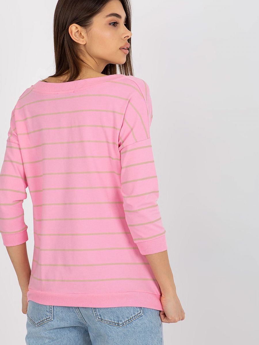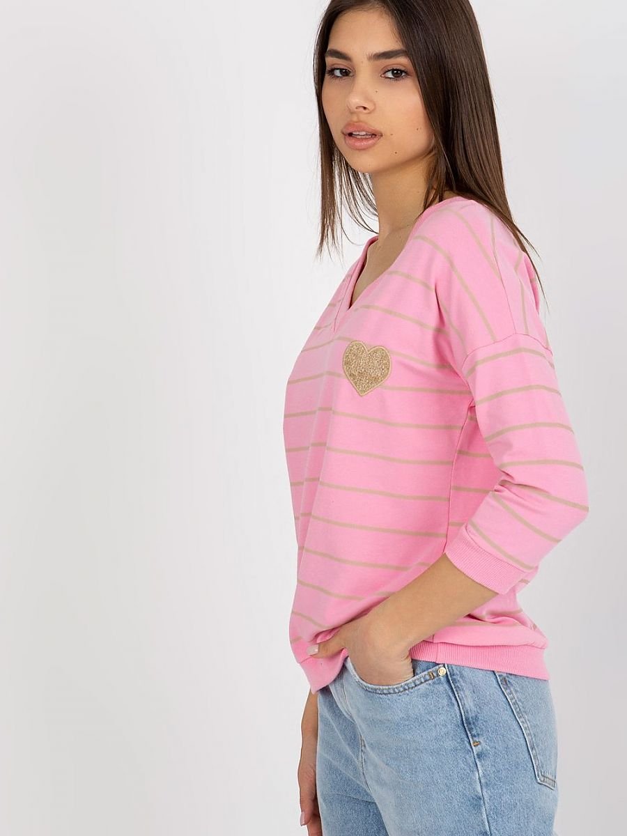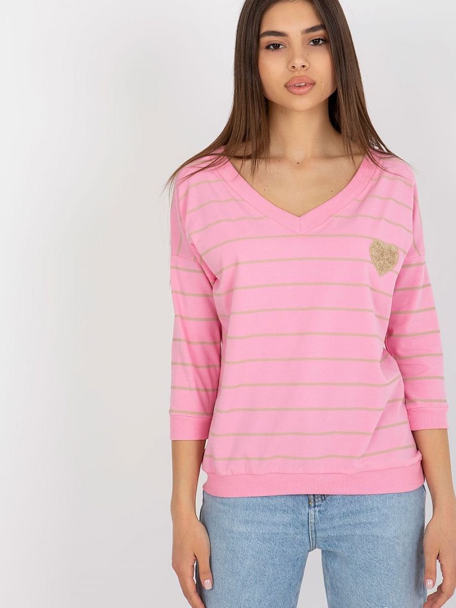 Bluzka o prostym kroju, rękawem 3/4 oraz dekoltem w serek. Na przodzie ozdobna naszywka.