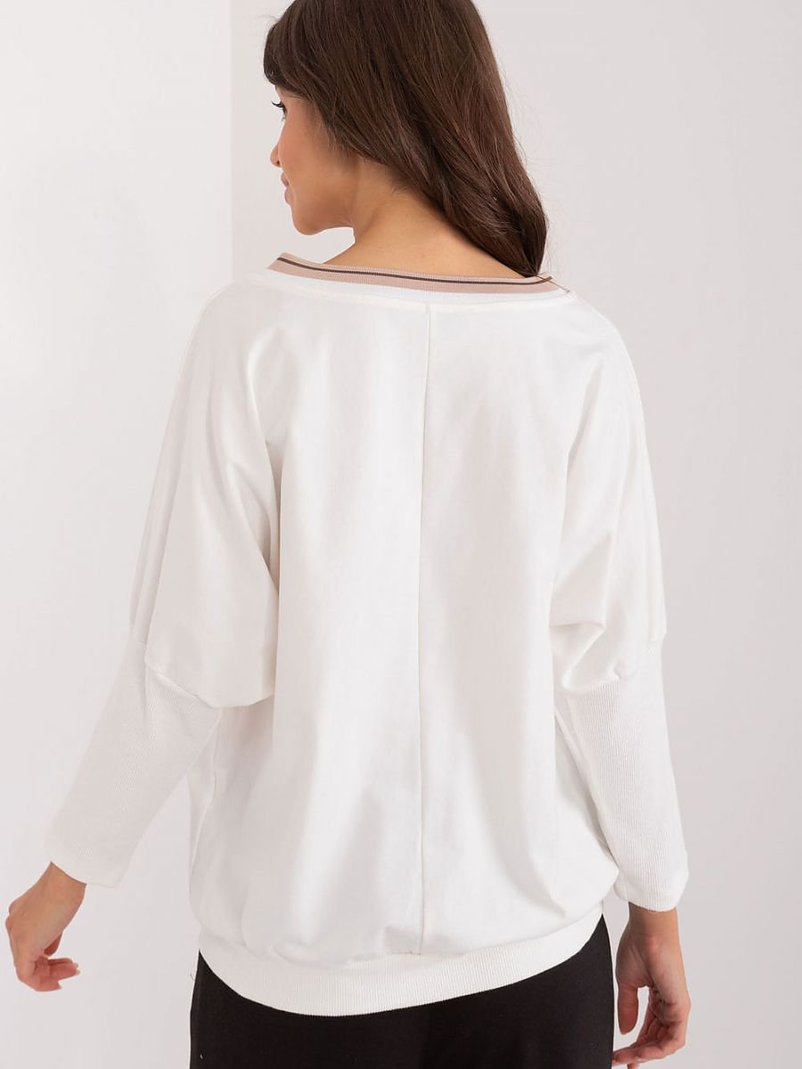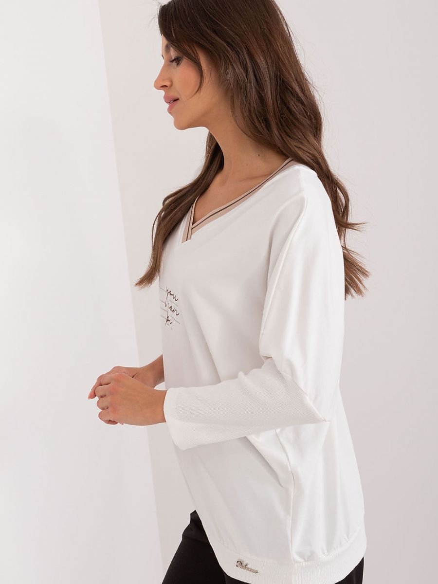 Przedstawiamy bluzkę, która łączy w sobie niezawodny komfort z casualowym stylem, idealną na codzienne noszenie. Ta bluzka utrzymana jest w swobodnym, casualowym stylu, który doskonale pasuje do codziennych sytuacji. Bluzka ozdobiona jest oryginalnym nadrukiem na przodzie, dodającym jej indywidualnego charakteru i wyrazistości. Wykonana głównie z wysokiej jakości bawełny, co gwarantuje komfort noszenia, miękkość i dobrą wentylację, pozwalając skórze oddychać przez cały dzień. Standardowa długość bluzki sprawia, że jest ona uniwersalna i nadaje się do różnych sylwetek i stylizacji. Rękawy 3/4 dodają bluzie lekkości i elegancji, idealne na cieplejsze dni lub do warstwowania. Dekolt w serek z kontrastowym ściągaczem nadaje bluzie modny akcent i sprawia, że jest bardziej intrygująca wizualnie. Subtelne dżety umieszczone na przodzie bluzy dodają jej wyjątkowego blasku i uroku. Ta bluza codzienna to nie tylko wyraz wygody i swobody, ale także stylowy element Twojej garderoby. Dzięki oryginalnemu nadrukowi i dodatkom, będzie ona doskonałym uzupełnieniem wielu codziennych stylizacji, dodając im indywidualnego charakteru i wyrazistości.
