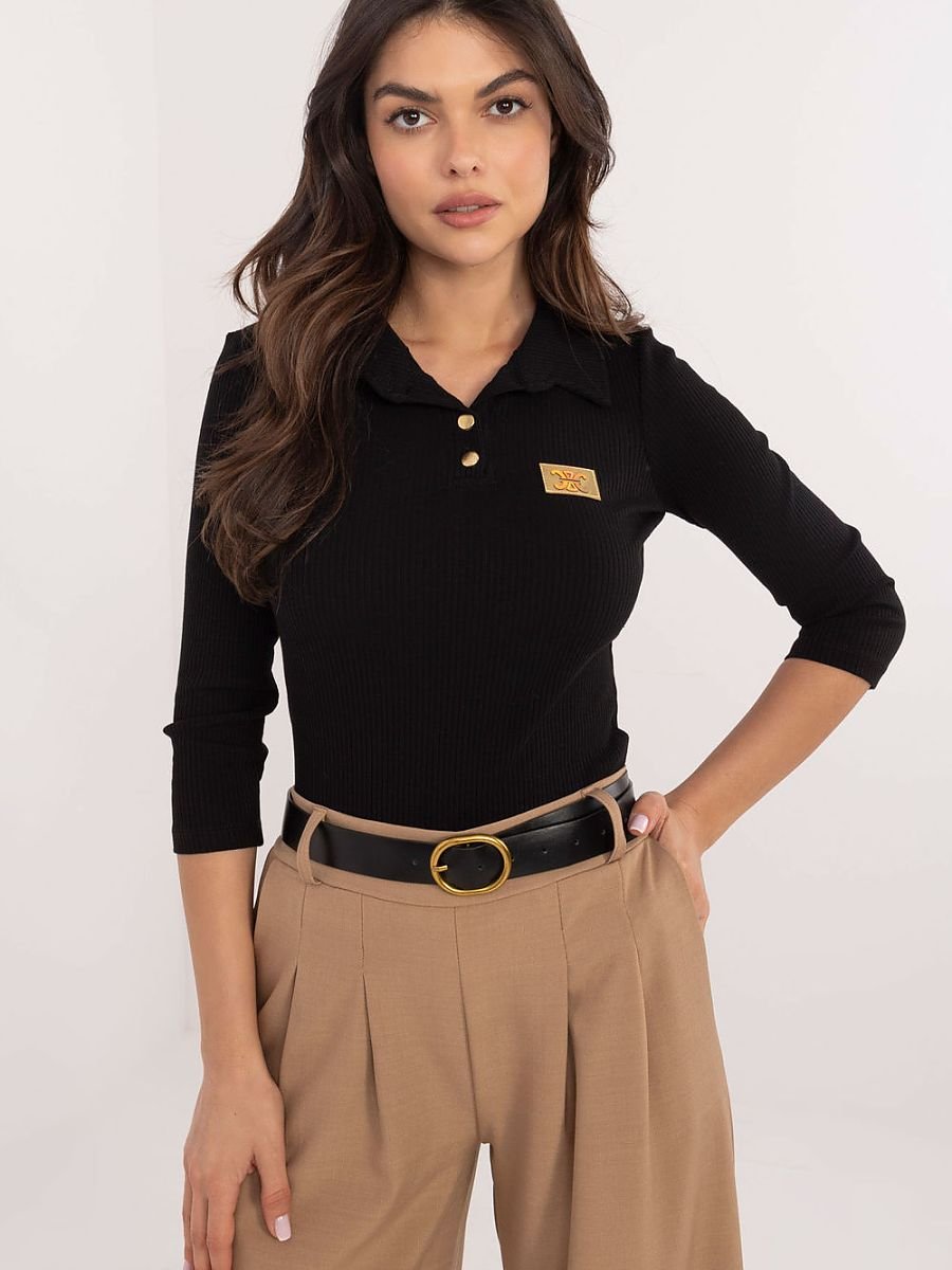 Bluzka damska w stylu casual, idealna na co dzień i do pracy. Wykonana z przyjemnego w dotyku, prążkowanego materiału, łączącego naturalną bawełnę z elastanem, co zapewnia wygodę i swobodę ruchów przez cały dzień. Model o standardowej długości, z rękawem o długości 3/4, nadaje się do różnych stylizacji, zarówno z jeansami, jak i eleganckimi spodniami. Bluzka posiada klasyczny kołnierzyk oraz subtelne zapięcie na trzy guziki z przodu, które dodaje jej uroku. Dodatkowym akcentem jest naszywka umieszczona na przodzie bluzki, podkreślająca jej unikalny charakter. Gładki wzór i casualowy styl sprawiają, że jest to doskonała propozycja na codzienne wyjścia.