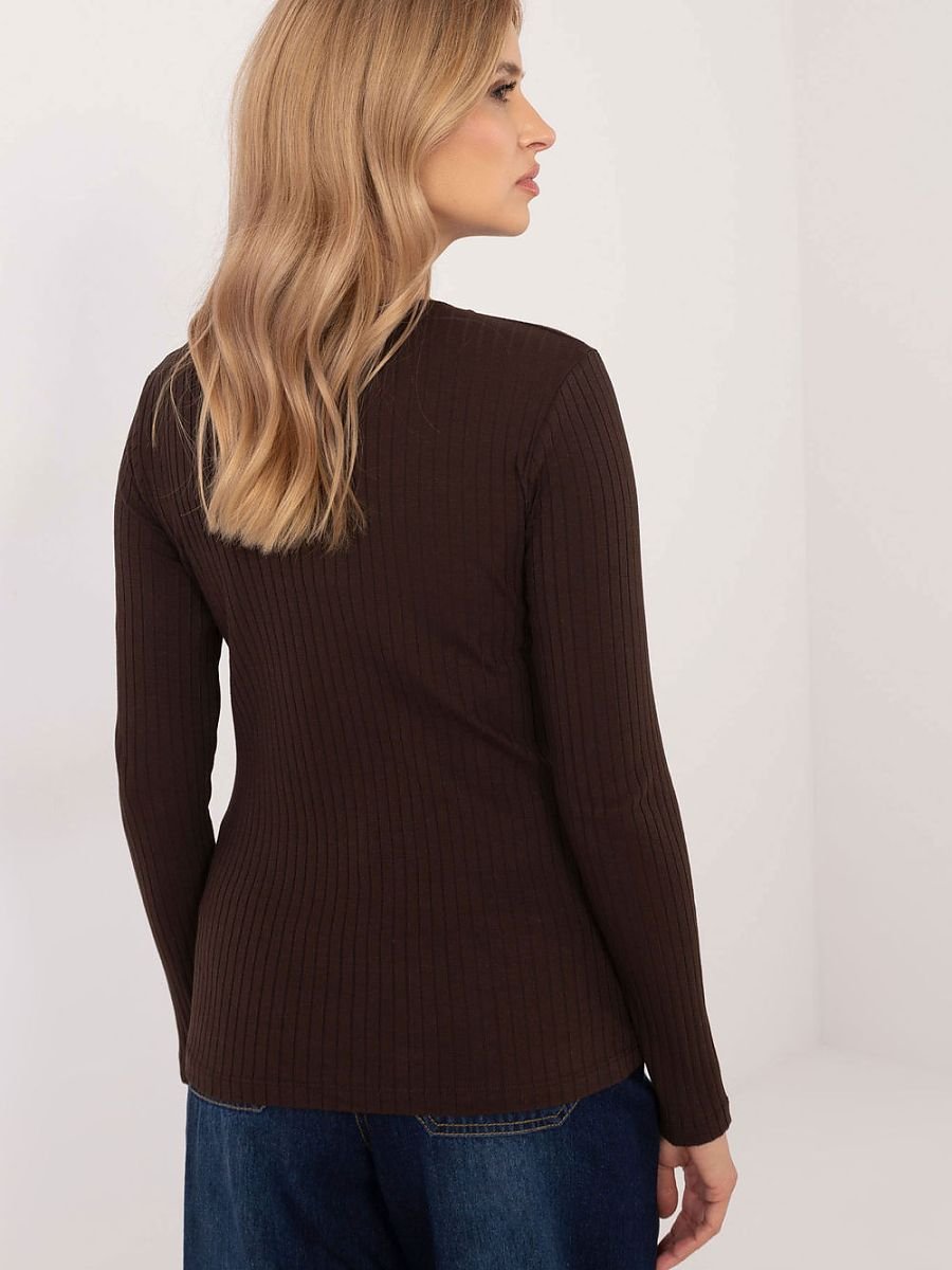 Dopasowana bluzka z prążkowanego materiału, idealna na co dzień i do pracy, łącząca elegancję z nowoczesnym stylem. Wykonana z wysokiej jakości mieszanki bawełny i elastanu, doskonale układa się na sylwetce, zapewniając komfort noszenia. Bluzka ma standardową długość, długi rękaw oraz klasyczny okrągły dekolt. Na ramionach znajduje się efektowny motyw zwierzęcy, który dodaje całości wyrazistości i charakteru. Dodatkowo ozdobiona guzikami na ramionach, wprowadza subtelny, dekoracyjny akcent. Brak zapięcia sprawia, że model jest wygodny i łatwy do noszenia, doskonale łącząc styl elegancki z casualowym.