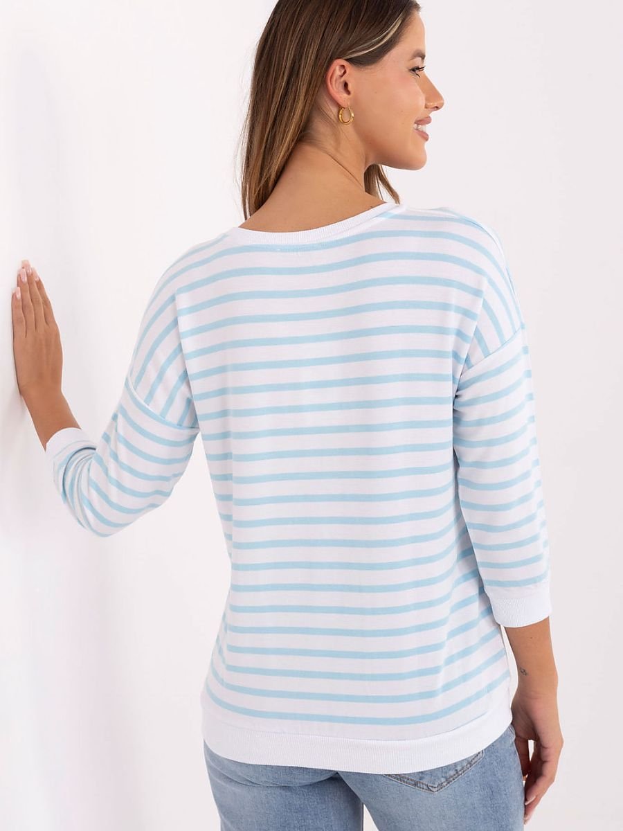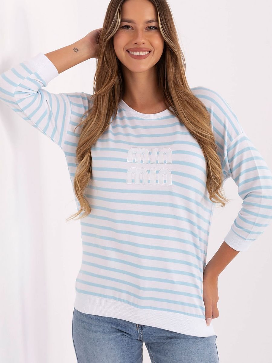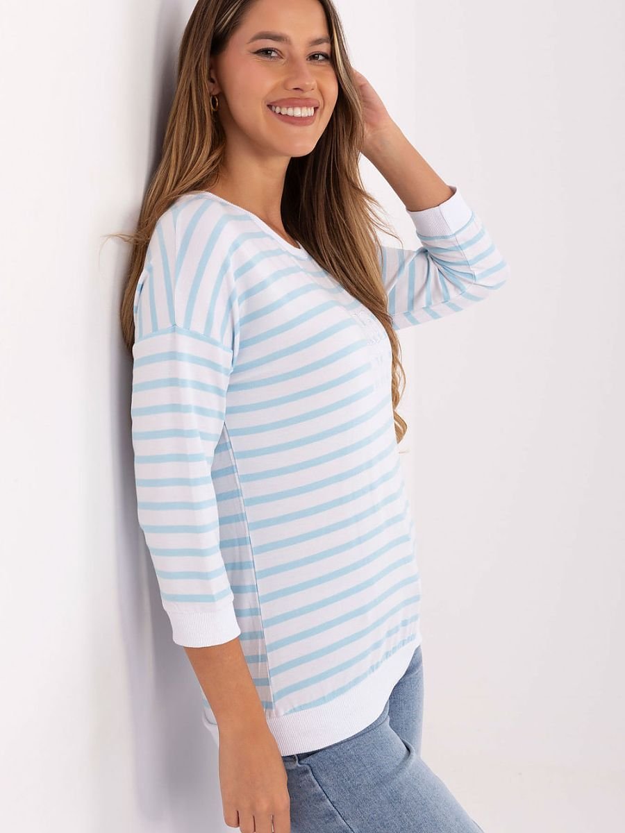 Casualowa bluzka damska wykonana z miękkiego mikromodalu z dodatkiem elastanu, który zapewnia komfort i idealne dopasowanie do sylwetki. Klasyczny, okrągły dekolt i długie rękawy sprawiają, że model jest wygodny i uniwersalny, doskonały zarówno na co dzień, jak i do pracy. Bluzka o standardowej długości zdobiona jest delikatnym wzorem w paski, a naszywki na przodzie dodają jej modnego, nowoczesnego charakteru. Model bez zapięcia, łatwy w stylizacji i łączeniu z innymi elementami garderoby.
