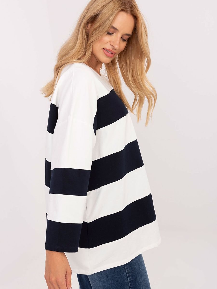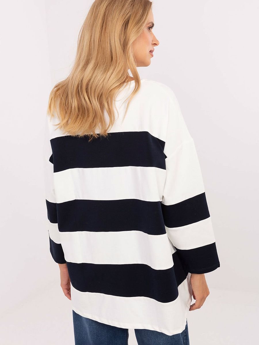 Bluzka oversize o casualowym charakterze, idealna na codzienne stylizacje. Wykonana z dominującej mieszanki bawełny i elastanu, zapewnia komfort noszenia oraz swobodę ruchów. Model o dłuższym kroju doskonale sprawdzi się w zestawieniach z legginsami czy wąskimi spodniami. Bluzka ma długie rękawy i klasyczny okrągły dekolt, a jej dominującym wzorem są ponadczasowe paski, które nadają całości lekkości i świeżości. Brak zapięcia podkreśla luźny, wygodny fason, wpisujący się w codzienny, niezobowiązujący styl.