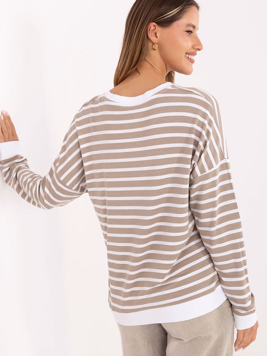 Casualowa bluzka damska w paski w stylu oversize to wygodna i modna propozycja na co dzień. Wykonana z miękkiego micro modalu z dodatkiem elastanu, zapewnia komfort noszenia oraz swobodę ruchów. Model o standardowej długości z długim rękawem i klasycznym okrągłym dekoltem został wykończony ściągaczami, które nadają bluzce nowoczesnego charakteru i subtelnie podkreślają sylwetkę. Idealna do codziennych, casualowych stylizacji, zarówno ze spodniami, jak i spódnicą.