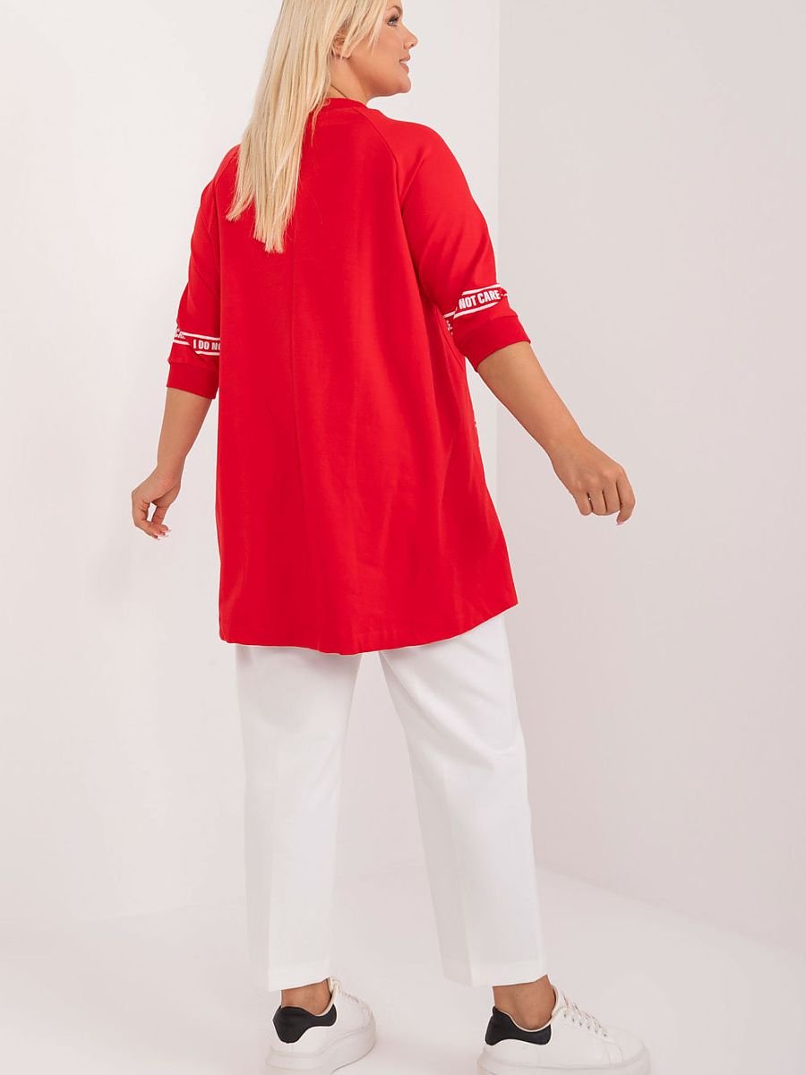 Asymetryczna bluzka plus size to codzienna propozycja o prostym, sukienkowym fasonie, idealna na co dzień. Wykonana z bawełny z dodatkiem elastanu, gwarantuje wygodę i lekkie dopasowanie. Przedłużany krój oraz rękaw 3/4 zapewniają swobodę ruchów oraz komfort. Bluzka ma okrągły dekolt, który dodaje klasycznego wykończenia. Na przodzie znajdują się napisy ozdobione dżetami, co nadaje bluzce modnego i oryginalnego charakteru. Idealna do codziennych stylizacji, zarówno do pracy, jak i na luźniejsze wyjścia.