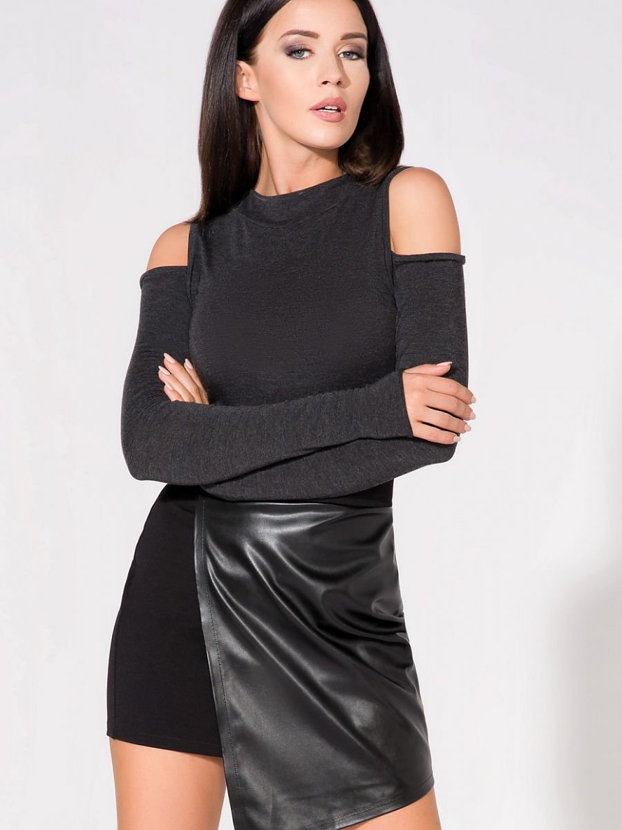 Bluzka z cienkiej dzianiny z odkrytymi ramionami. Przy dekolcie półgolf. Dół oraz rękaw pozostawione w stanie surowym.