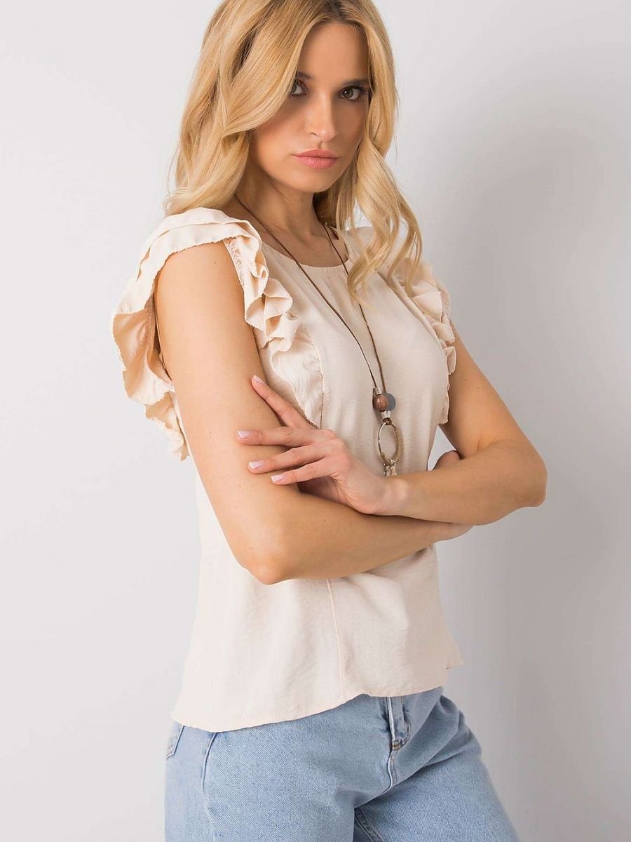 Bluzka z krótkim rękawkiem w formie falbanki. Dekolt okrągły, na plecach wycięcie z wiązaniem.
