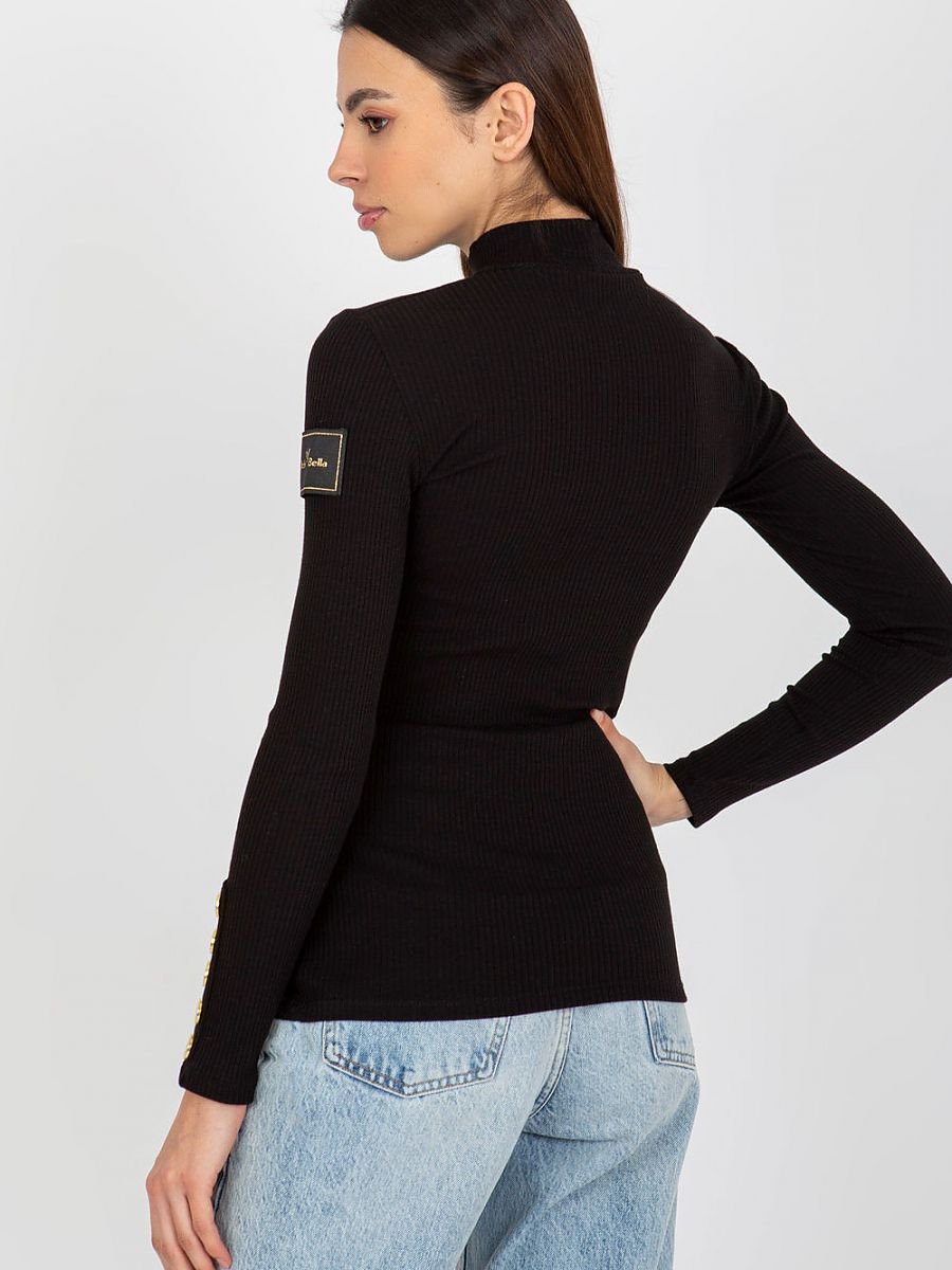 Bluzka z długim rękawem oraz półgolfem, wykonana z prążkowanej tkaniny. Na ramionach ozdobne guziki.