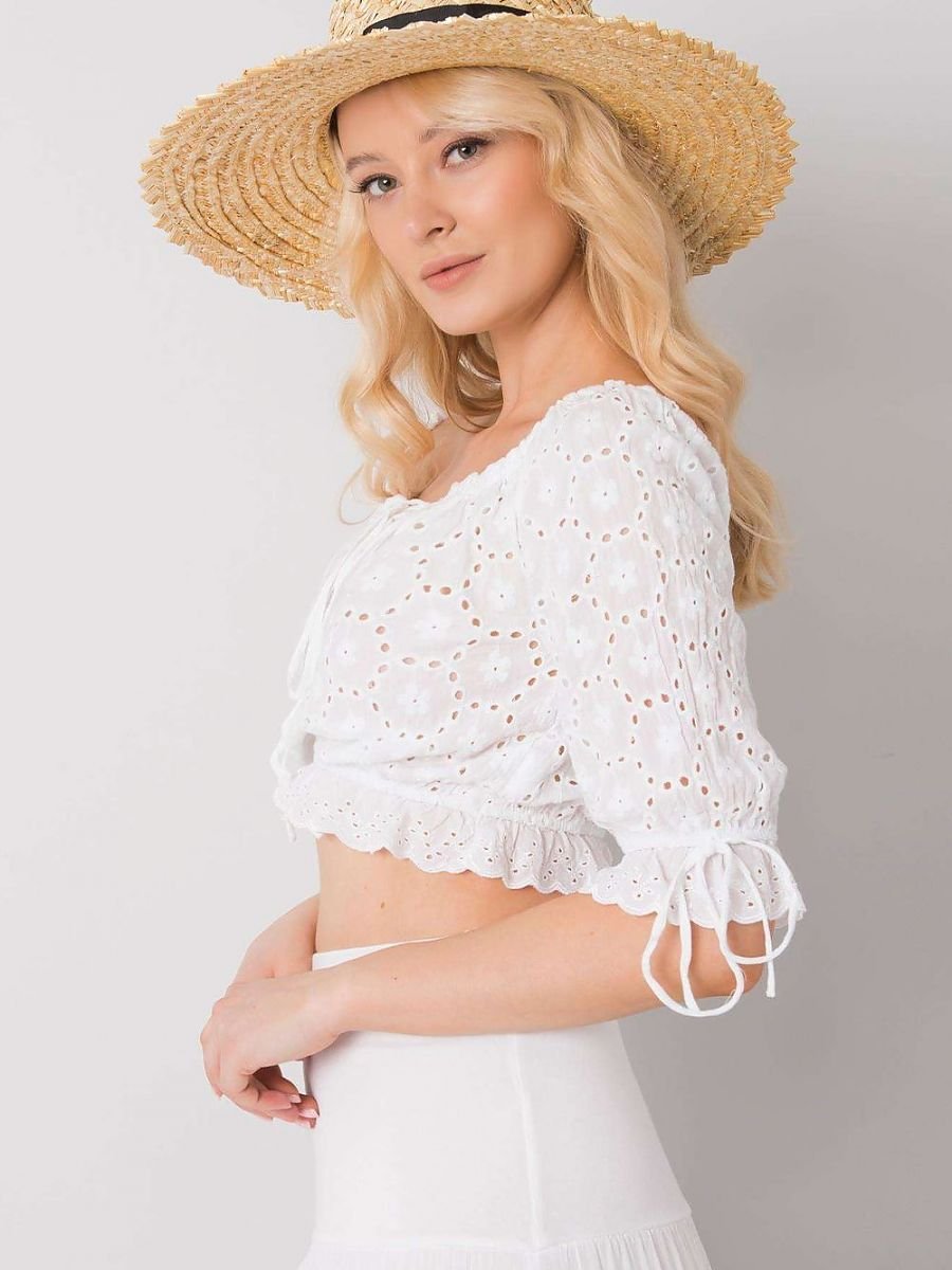 Ciekawa krótka bluzka z krótkim rękawkiem, wykonana z materiału w ażurowy wzór. Na przodzie i rękawkach wiązanie.