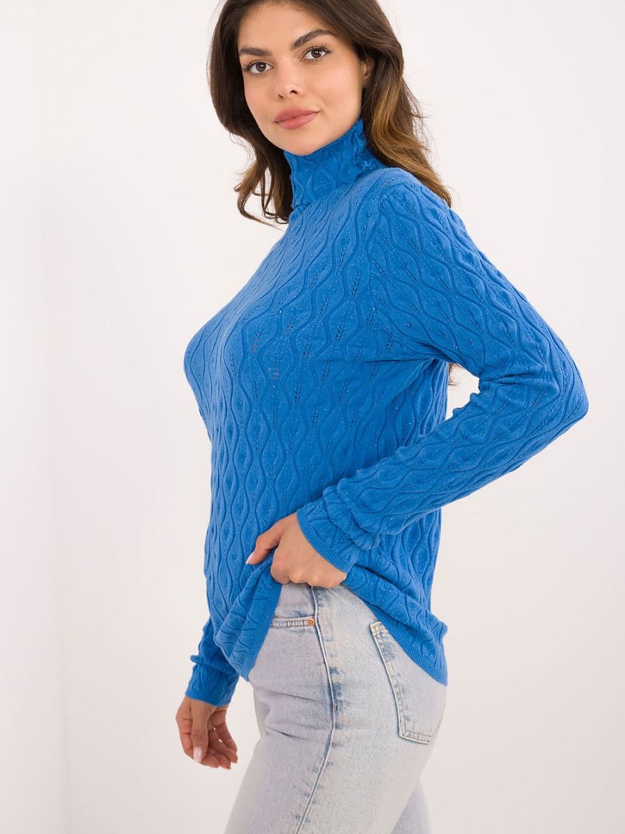 Casualowy sweter z golfem o wyjątkowym, ażurowym wzorze, idealny na co dzień i do pracy. Wykonany z miękkiej wiskozy z dodatkami, dzięki czemu zapewnia komfort noszenia i subtelne dopasowanie. Standardowa długość oraz długie rękawy czynią go uniwersalnym elementem garderoby, a delikatna, błyszcząca nitka wpleciona w materiał dodaje mu eleganckiego charakteru. Bez zapięcia, sweter ma minimalistyczny fason, który łatwo dopasować do różnych stylizacji, dodając im nutę szyku i wyjątkowości.