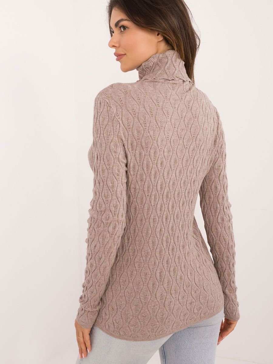 Casualowy sweter z golfem o wyjątkowym, ażurowym wzorze, idealny na co dzień i do pracy. Wykonany z miękkiej wiskozy z dodatkami, dzięki czemu zapewnia komfort noszenia i subtelne dopasowanie. Standardowa długość oraz długie rękawy czynią go uniwersalnym elementem garderoby, a delikatna, błyszcząca nitka wpleciona w materiał dodaje mu eleganckiego charakteru. Bez zapięcia, sweter ma minimalistyczny fason, który łatwo dopasować do różnych stylizacji, dodając im nutę szyku i wyjątkowości.