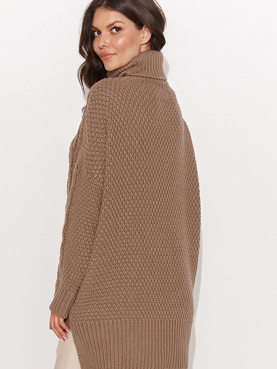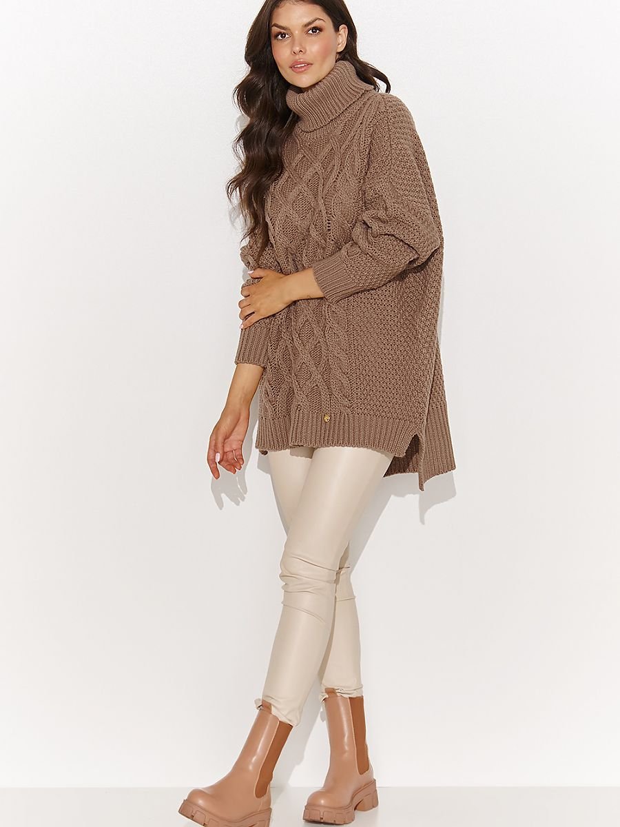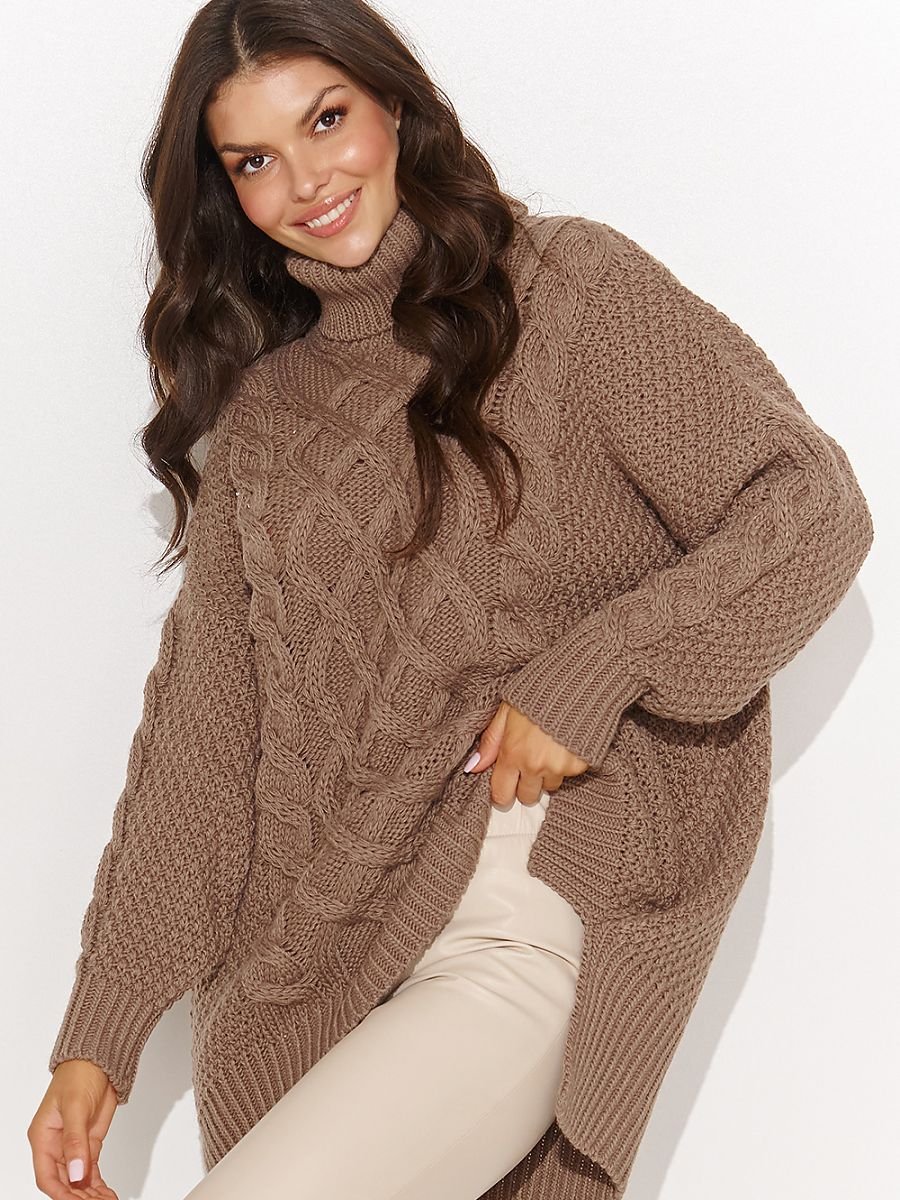 Ciepły i mięsisty damski sweter. To prawdziwa gratka dla miłośniczek zimowej wygody. Sweter jest wkładany przez głowę. Posiada asymetryczny fason, z tyłu nieco dłuższy niż z przodu. Po bokach swetra widoczne jest rozcięcie, co dodaje mu lekkości i swobody. Sweter jest wyposażony w obszerny i ciepły golf oraz długie rękawy z praktycznymi ściągaczami na końcach. Jego charakterystyczną cechą są różnego rodzaju wzory, włączając w to widowiskowe warkocze umieszczone z przodu. Ten sweter doskonale komponuje się z legginsami lub obcisłymi spodniami, i może być noszony jako tunika. Dostępny w trzech wersjach kolorystycznych. Ten model swetra pozwoli Ci wyrazić swój indywidualny styl i zapewni niesamowitą swobodę, jednocześnie dodając charakteru Twojemu wyglądowi.