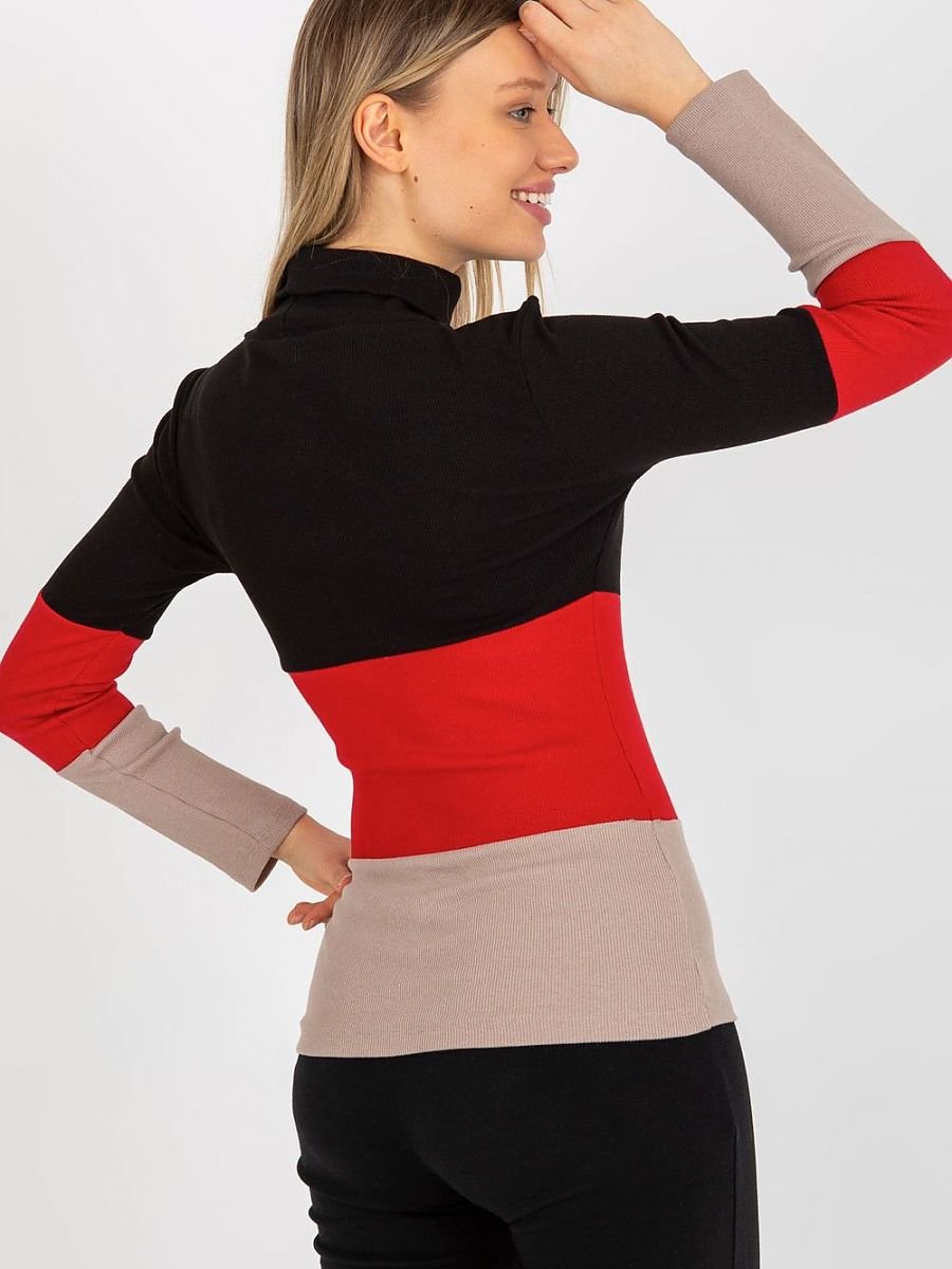 Sweter damski z długim rękawem oraz golfem. Sweter wykonany z prążkowanej tkaniny w trzech kolorach.