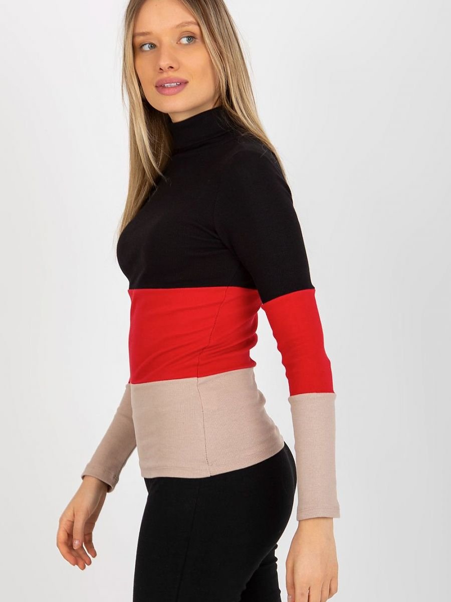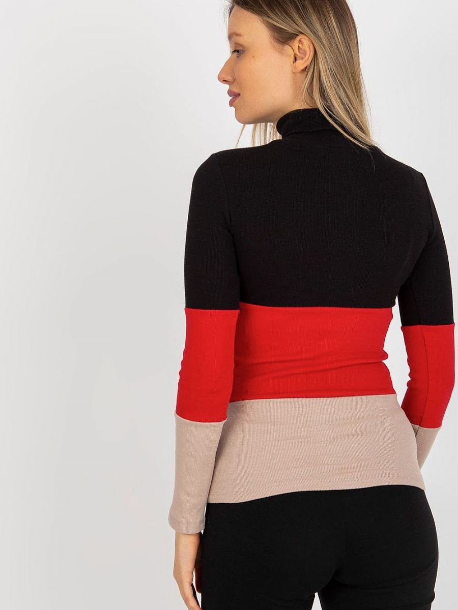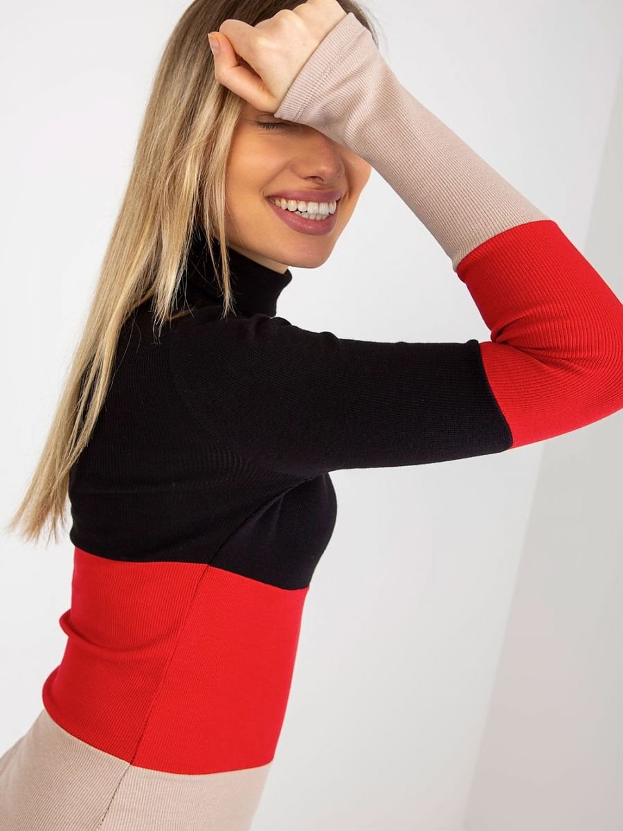 Sweter damski z długim rękawem oraz golfem. Sweter wykonany z prążkowanej tkaniny w trzech kolorach.