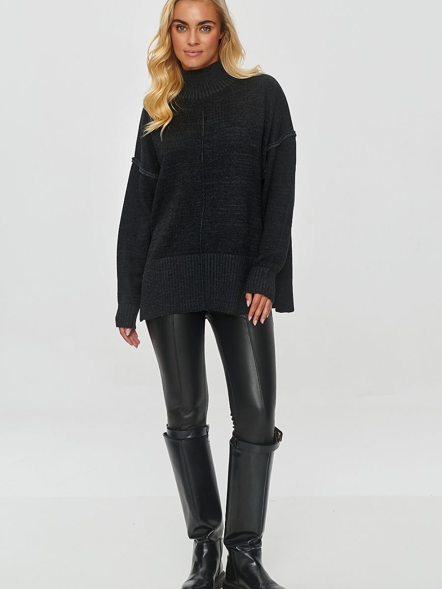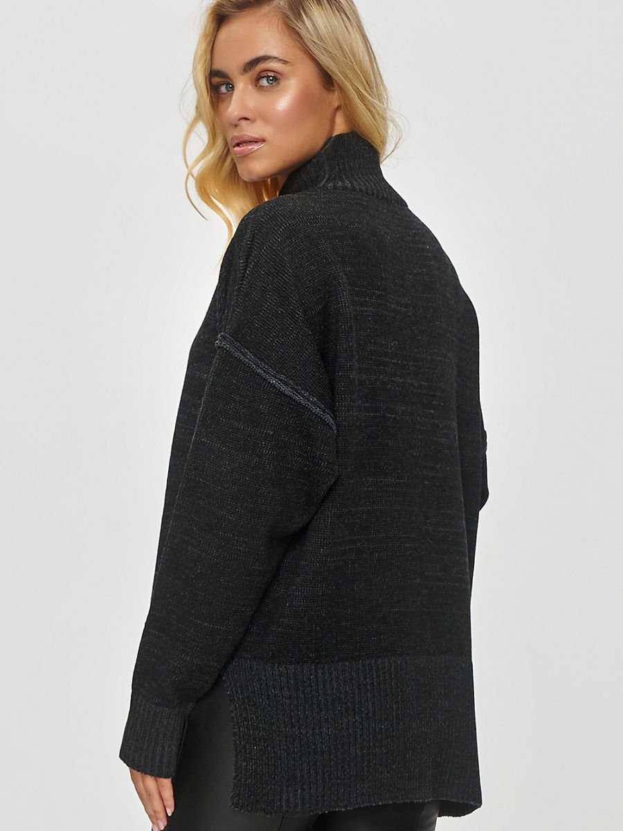 Oversizeowy sweter damski w kolorach melanżowych. Sweter ma luźny krój z obniżoną linią ramion, co nadaje mu casualowego, wygodnego charakteru. Wysoki, zabudowany dekolt typu półgolf oraz szerokie ściągacze na rękawach i na dole swetra dodają mu ciepła i komfortu, idealnego na chłodniejsze dni. Sweter ma dłuższy fason, sięgający za biodra, z bocznymi rozcięciami, co dodaje mu nowoczesności i ułatwia noszenie z różnymi elementami garderoby, jak na przykład legginsy czy wąskie spodnie. Melanżowy wzór materiału dodaje tekstury i przyciąga uwagę, sprawiając, że sweter jest stylowy a jednocześnie uniwersalny. Całość dopełnia przechodzący przez środek efektowny szew. Jest to doskonały wybór na codzienne stylizacje, szczególnie w połączeniu z bardziej dopasowanymi dolnymi częściami stroju, co pozwala zachować równowagę sylwetki.
