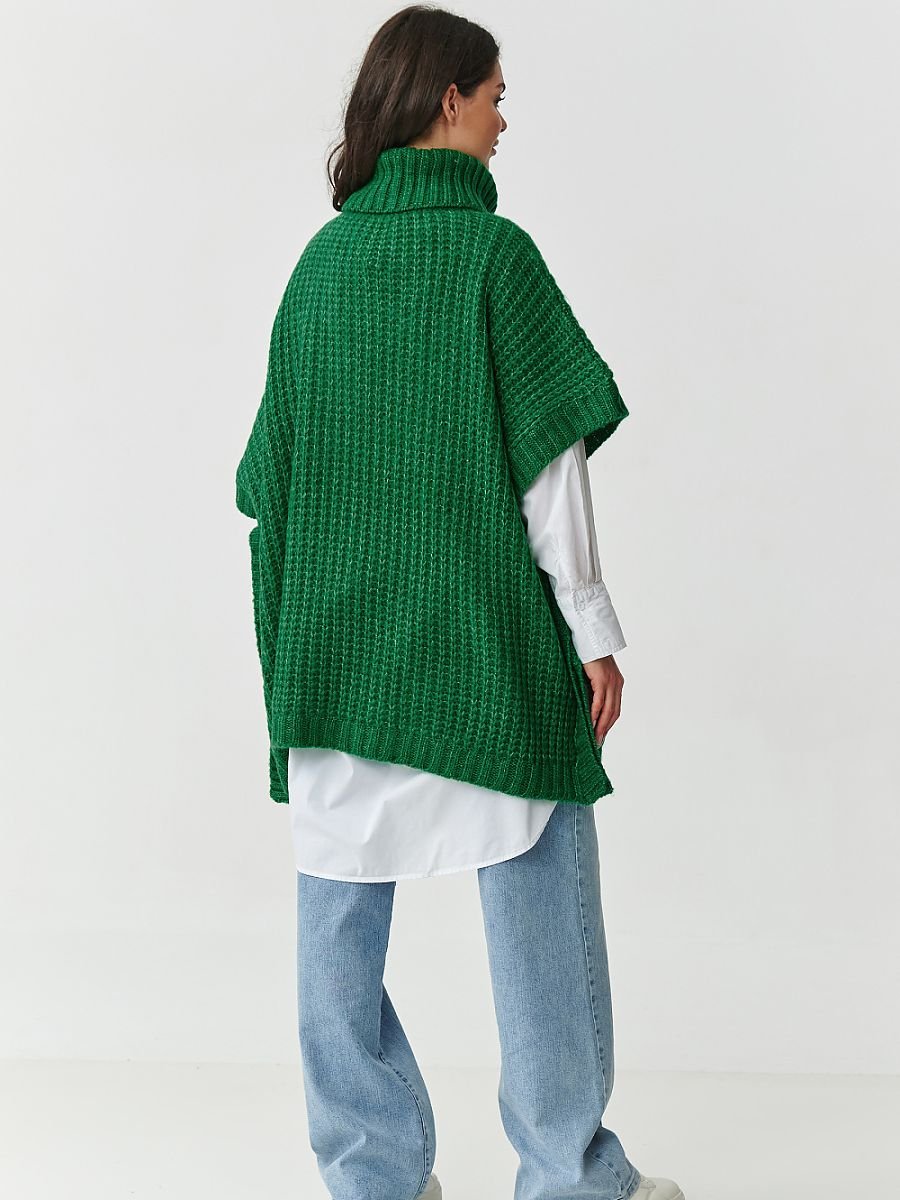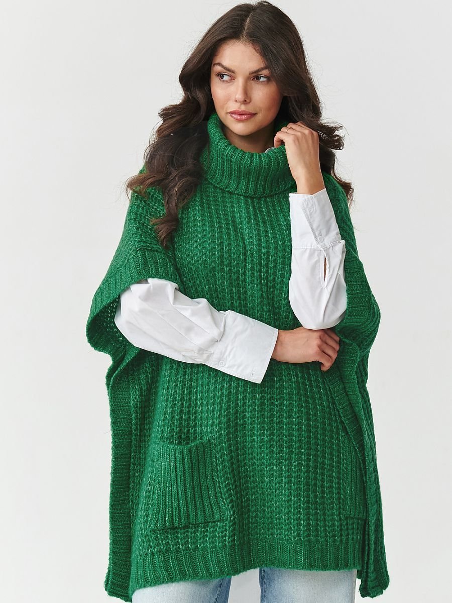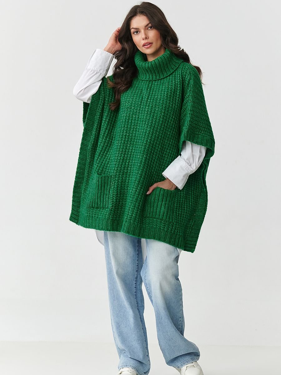 Odkryj wyjątkowy sweter damski w formie poncza, który łączy w sobie modny design i niezrównany komfort noszenia. Luźny, oversizeowy fason z rękawem do łokcia i wysokim, nieprzylegającym golfem otula sylwetkę, dodając stylu i zapewniając ciepło nawet w chłodniejsze dni. Praktyczne, duże kieszenie z przodu nadają mu swobodnego charakteru i sprawiają, że świetnie sprawdzi się zarówno na co dzień, jak i w bardziej eleganckich stylizacjach. Dodatkowo rękawy i dół wykończone wąskim ściągaczem. Sweter uszyty został z wysokiej jakości mieszanki włókien: akrylu, poliestru, wełny i poliamidu, dzięki czemu jest miękki, przyjemny w dotyku, a jednocześnie trwały i odporny na odkształcenia. Strukturalny, grubszy splot podkreśla jego wyjątkowy charakter, czyniąc go idealnym wyborem na jesień i zimę. Dostępny w ponadczasowych, modnych kolorach: beżowy melanż ? klasyka, która pasuje do wszystkiego, butelkowa zieleń ? głęboka i elegancka, czekoladowy ? ciepły i zmysłowy odcień, grafitowy melanż ? nowoczesny i uniwersalny. Jeśli szukasz swetra, który będzie zarówno praktyczny, jak i stylowy, ten model to strzał w dziesiątkę. Doskonale komponuje się z jeansami, legginsami czy klasyczną koszulą, tworząc efektowne, warstwowe stylizacje. Postaw na ciepło, wygodę i ponadczasową elegancję, wybierz sweter ponczo z golfem i kieszeniami, który szybko stanie się ulubionym elementem Twojej jesienno-zimowej garderoby.