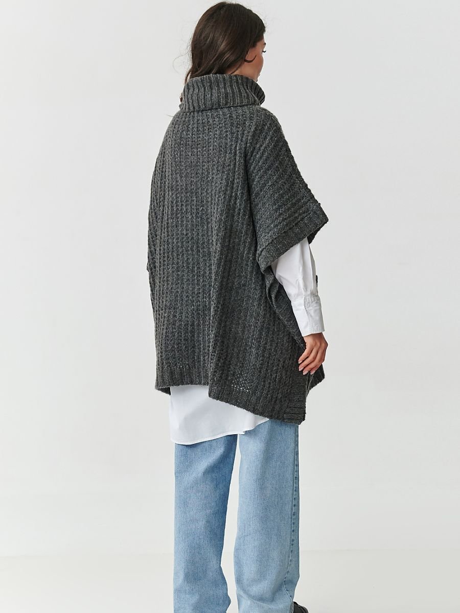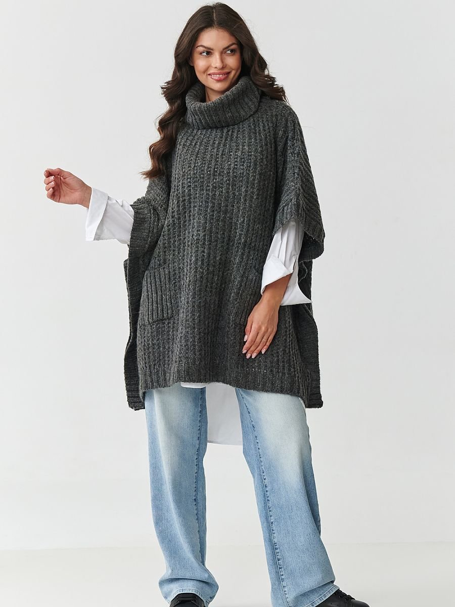 Odkryj wyjątkowy sweter damski w formie poncza, który łączy w sobie modny design i niezrównany komfort noszenia. Luźny, oversizeowy fason z rękawem do łokcia i wysokim, nieprzylegającym golfem otula sylwetkę, dodając stylu i zapewniając ciepło nawet w chłodniejsze dni. Praktyczne, duże kieszenie z przodu nadają mu swobodnego charakteru i sprawiają, że świetnie sprawdzi się zarówno na co dzień, jak i w bardziej eleganckich stylizacjach. Dodatkowo rękawy i dół wykończone wąskim ściągaczem. Sweter uszyty został z wysokiej jakości mieszanki włókien: akrylu, poliestru, wełny i poliamidu, dzięki czemu jest miękki, przyjemny w dotyku, a jednocześnie trwały i odporny na odkształcenia. Strukturalny, grubszy splot podkreśla jego wyjątkowy charakter, czyniąc go idealnym wyborem na jesień i zimę. Dostępny w ponadczasowych, modnych kolorach: beżowy melanż ? klasyka, która pasuje do wszystkiego, butelkowa zieleń ? głęboka i elegancka, czekoladowy ? ciepły i zmysłowy odcień, grafitowy melanż ? nowoczesny i uniwersalny. Jeśli szukasz swetra, który będzie zarówno praktyczny, jak i stylowy, ten model to strzał w dziesiątkę. Doskonale komponuje się z jeansami, legginsami czy klasyczną koszulą, tworząc efektowne, warstwowe stylizacje. Postaw na ciepło, wygodę i ponadczasową elegancję, wybierz sweter ponczo z golfem i kieszeniami, który szybko stanie się ulubionym elementem Twojej jesienno-zimowej garderoby.
