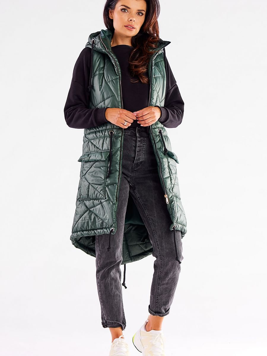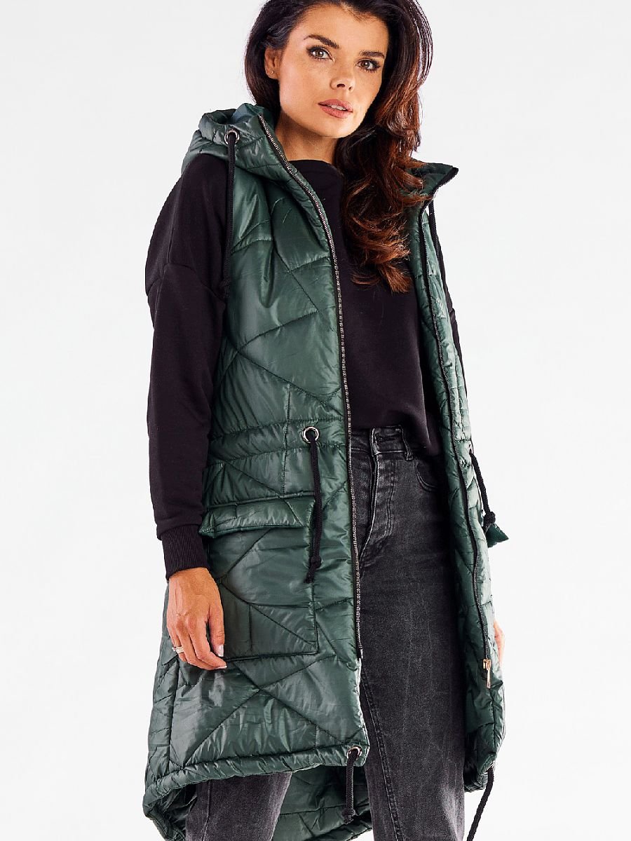 Absolutny must have tej jesieni. Kamizelka uszyta z pikowanej błyszczącej tkaniny. Kamizelka na podszewce, z kapturem i kieszeniami. Ściągacze w pasie pozwalają regulować szerokość według preferencji. Idealna na pierwsze jesienne chłodniejsze wieczory. Produkt wyprodukowany w Polsce.