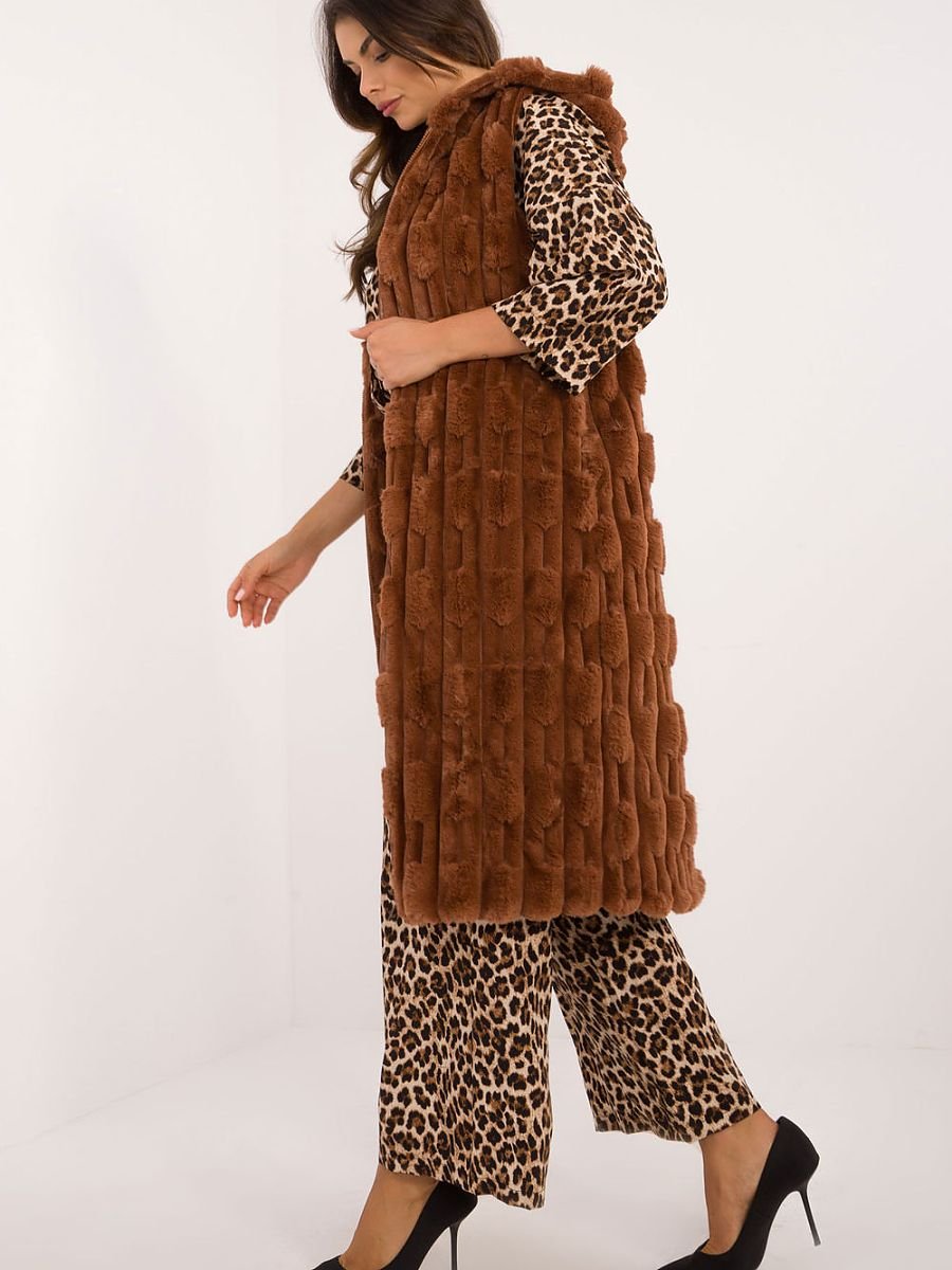 Stworzona z myślą o kobietach ceniących elegancję i komfort, ta kamizelka futrzana to wyjątkowy element Twojej garderoby. Kamizelka jest perfekcyjnym połączeniem elegancji i wygody. Jej szlachetny design sprawia, że idealnie nadaje się do noszenia w formalnych sytuacjach, do pracy czy na ważne spotkania biznesowe. Dzięki swojemu wysmakowanemu charakterowi, kamizelka świetnie sprawdzi się jako element stroju do pracy oraz na wizytówki okazje, nadając Twojej stylizacji wyjątkowego charakteru. Kamizelka wykonana jest z wytrzymałego i łatwego w pielęgnacji poliestru. To materiał, który nie tylko prezentuje się luksusowo, ale także zapewnia wygodę noszenia. Przeznaczona na chłodniejsze dni, kamizelka futrzana doskonale chroni przed zimnem, jednocześnie dodając elegancji każdej stylizacji. Kamizelka wyposażona jest w subtelne, ale skuteczne ocieplenie, co czyni ją nie tylko modnym dodatkiem, ale również funkcjonalnym elementem garderoby na zimowe dni. Długość kamizelki, sięgająca przed kolano, nadaje całości szykownego wyglądu, podkreślając jednocześnie subtelność fasonu. Dodatkowy element w postaci kaptura dodaje kamizelce nieco nonszalancji, a jednocześnie chroni przed zimnem i wiatrem. Wygodne zapięcie na zamek pozwala szybko i łatwo dostosować kamizelkę do zmieniających się warunków atmosferycznych. Funkcjonalne kieszenie wsuwane są praktycznym dodatkiem, umożliwiającym przechowywanie najpotrzebniejszych drobiazgów. Ta kamizelka futrzana to nie tylko modny element garderoby, ale także praktyczny wybór na zimowe dni, który pozwala poczuć się elegancko i wyjątkowo w każdej sytuacji.