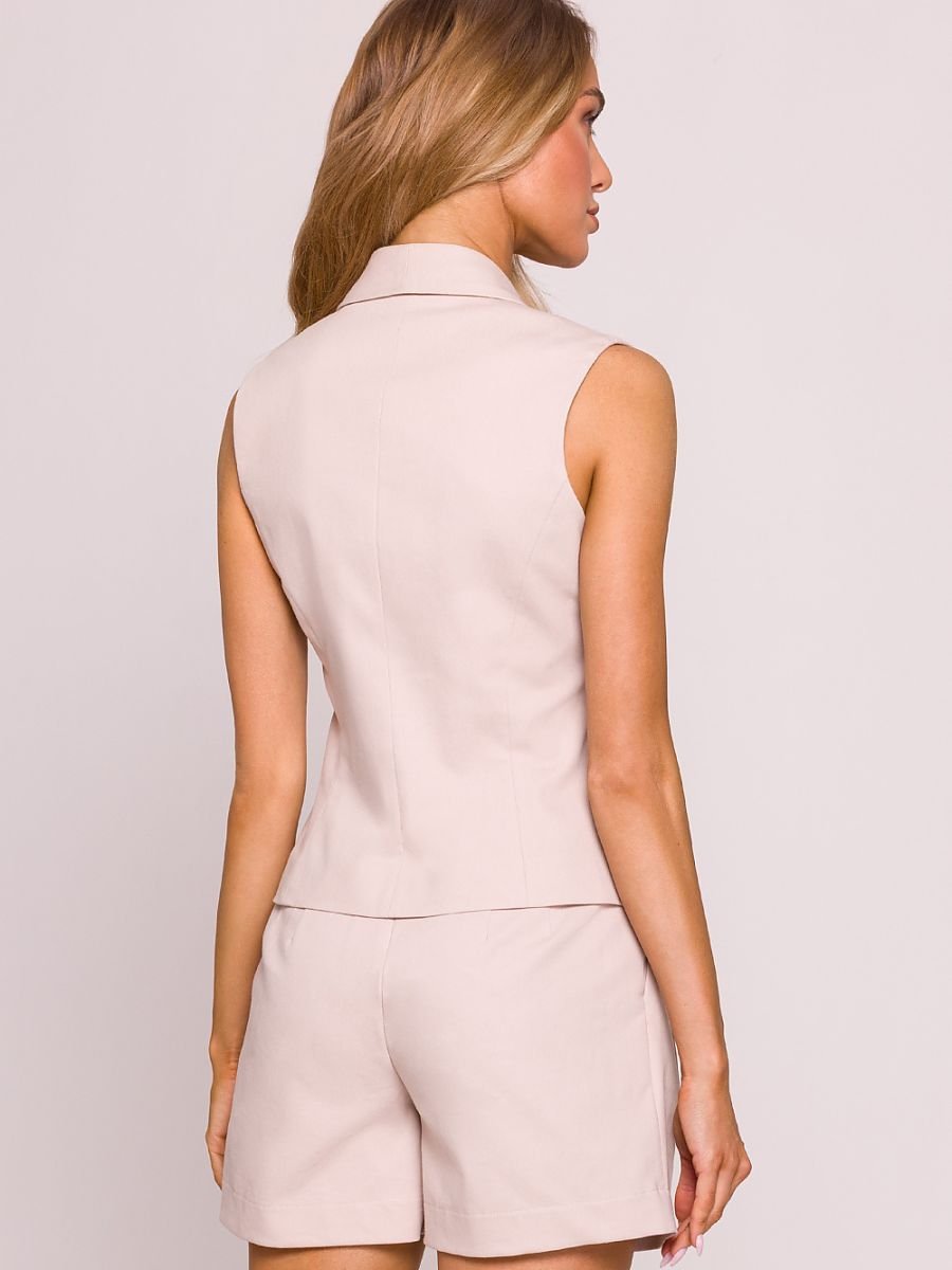 Stylowa, dopasowana kamizelka uszyta z wysokiej jakości bawełnianej tkaniny o matowym wykończeniu. Jej głęboki dekolt w kształcie litery V oraz szalowy kołnierz nadają całości wyrafinowanego charakteru, idealnie komponując się zarówno z koszulą, jak i noszona solo. Model zapinany na trzy guziki oblekane tkaniną, co dodaje elegancji i spójności stylistycznej. Z przodu znajdują się imitacje kieszeni, które subtelnie podkreślają klasyczną formę bez zaburzania linii sylwetki. Lekko taliowany fason pięknie akcentuje figurę, a długość do linii talii sprawia, że kamizelka świetnie uzupełnia zarówno casualowe, jak i bardziej formalne stylizacje. Zaprojektowano i uszyto w Polsce z dbałością o detale i jakość wykonania. Podszewka 60% wiskoza, 35% poliester, 5% elastan.
