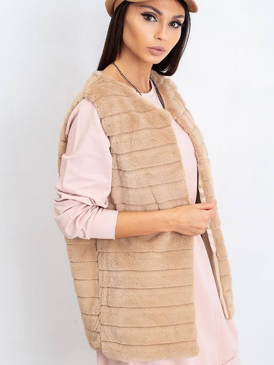 Kamizelka futrzana w kolorze beżowym, zapinana na haftki, posiada podszewkę.