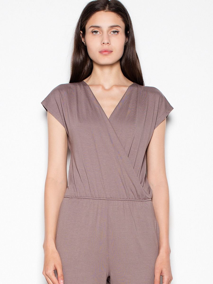 Sportowy kombinezon z krótkim rękawem oraz długimi, zwężanymi nogawkami. Model wykończony efektownym, kopertowym dekoltem i ściągaczem w pasie podkreślającym sylwetkę.
