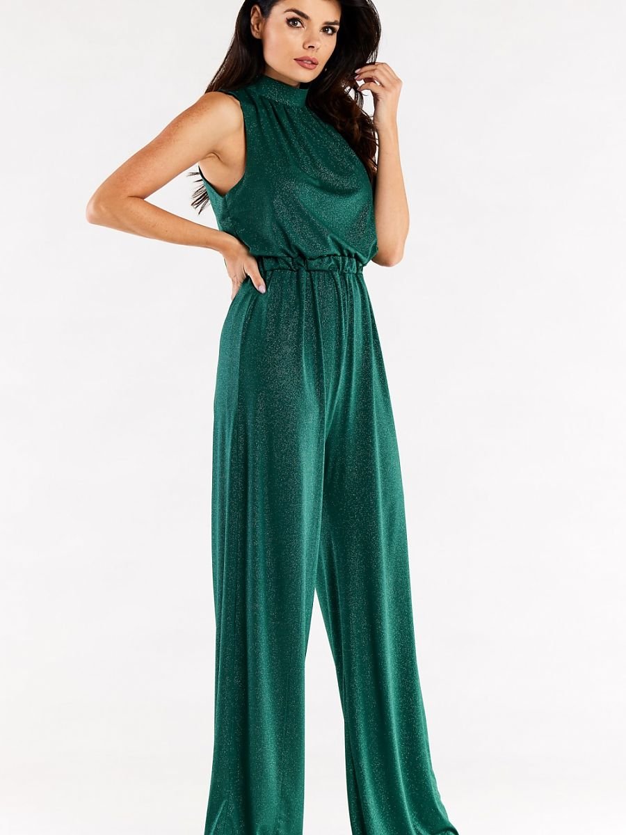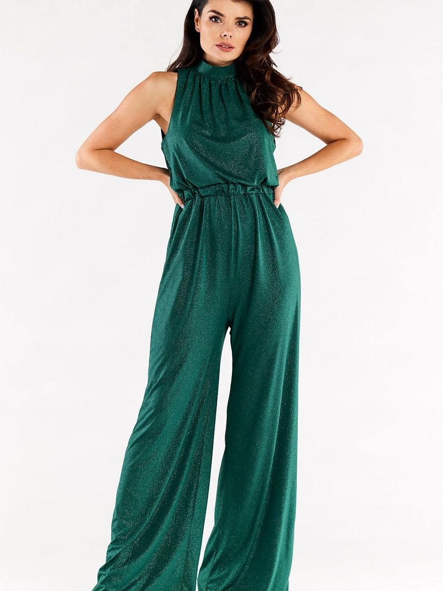Kombinezon z szerokimi nogawkami, dekolt przodu i tyłu marszczony na wiązanej stójce. Na plecach rozcięcie do pasa, który jest marszczony szeroką gumą. Kombinezon uszyty na elastycznej podszewce. Kombinezon wyprodukowana w Polsce.