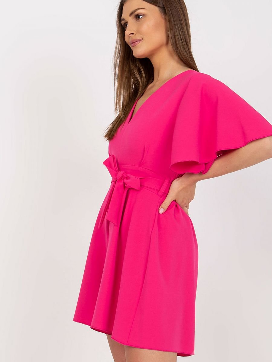 Kombinezon letni z krótkim rękawkiem oraz dekoltem w serek. Na plecach wycięcie, w talii wiązaniem. Propozycja idealna na wiele okazji.