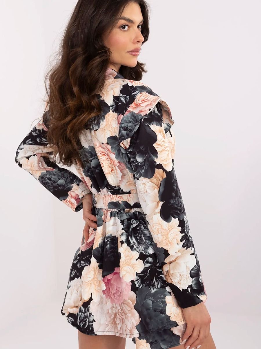 Elegancki damski kombinezon to stylowa propozycja na wiele okazji idealny do pracy, na wizytowe spotkania czy imprezy. Wykonany z lekkiej i przyjemnej w noszeniu mieszanki poliestru i wiskozy, gwarantuje komfort oraz doskonałe dopasowanie do sylwetki. Modny nadruk w kwiaty nadaje mu kobiecego uroku, a falbanki na ramionach subtelnie podkreślają stylowy charakter. Kombinezon ma długość mini, co dodaje mu lekkości i wdzięku, a długie rękawy oraz klasyczny kołnierzyk wprowadzają elegancki akcent. Zapięcie na guziki oraz pasek podkreślający talię sprawiają, że całość prezentuje się wyjątkowo szykownie i kobieco. To idealna propozycja dla kobiet ceniących połączenie klasyki z nowoczesnym designem.