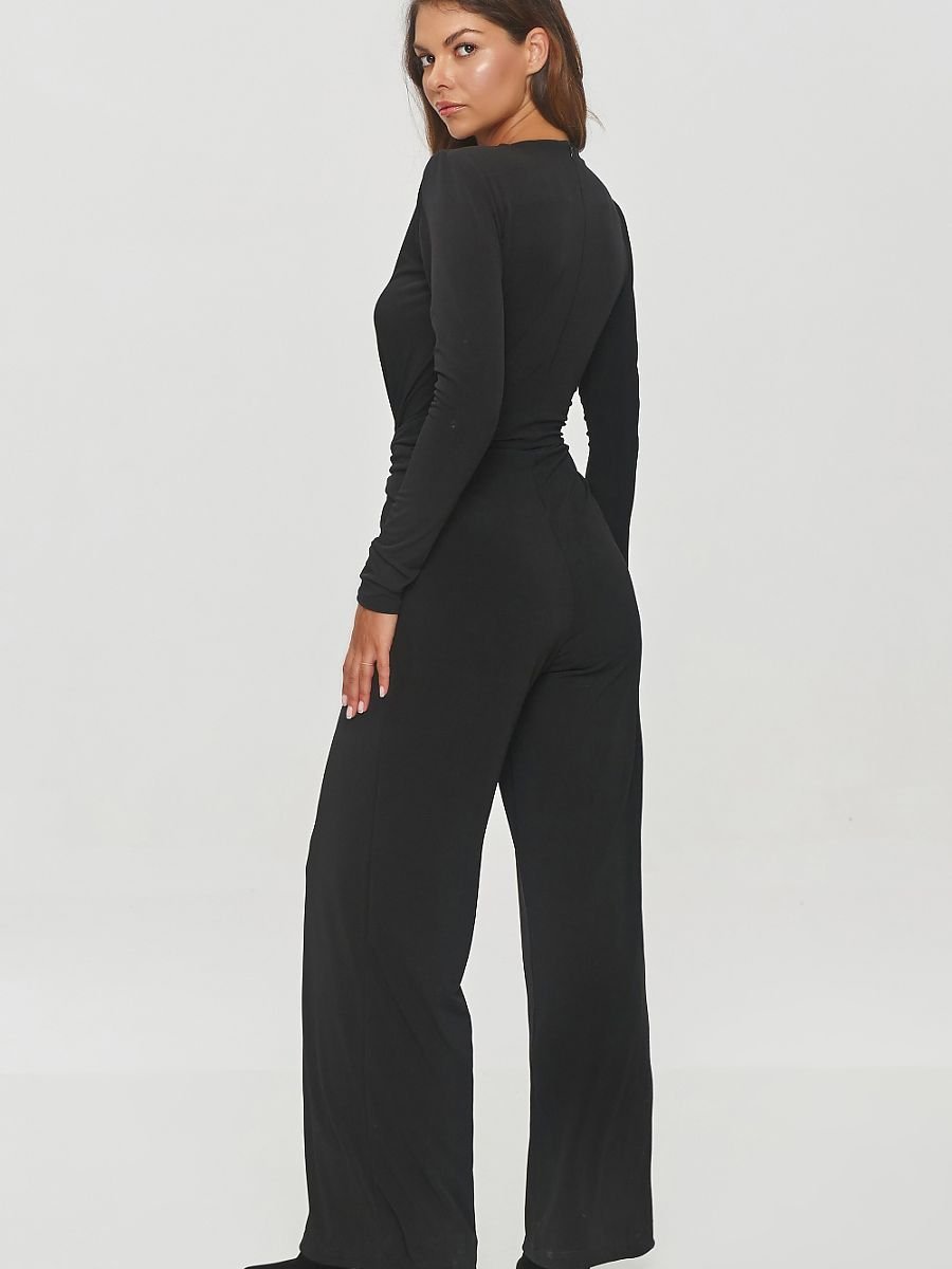 Stylowy czarny kombinezon wykonany z eleganckiego i elastycznego materiału to absolutny modowy must have dla kobiety. Model ma dekolt w serek i długie rękawy, co tworzy szykowny i smukły wygląd. Umieszczone na ramionach poduszki dodają mu klasy i pięknie akcentują linię ramion. Talia jest podkreślona skręconym węzłem, dodając subtelny, ale wyrafinowany akcent do całego projektu. Spodnie mają szerokie nogawki, co nadaje strojowi płynności i ruchu. Materiał jest miękki i ładnie się układa, podkreślając ogólny dystyngowany wygląd. Ten kombinezon jest wszechstronny i można go nosić z obcasami na bardziej formalne okazje lub nosić swobodnie z płaskimi butami.