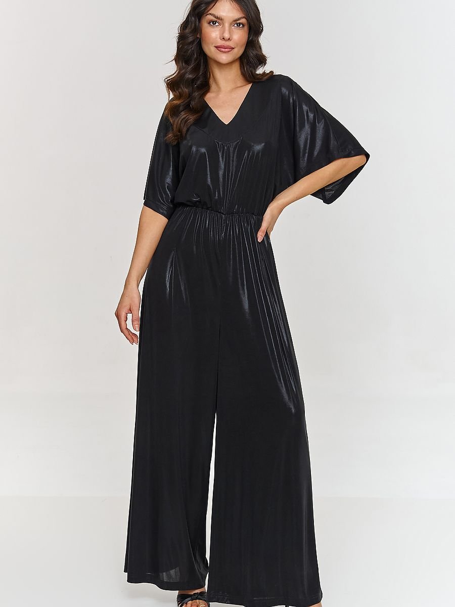 Ten kombinezon to połączenie elegancji i wygody, który z pewnością przyciągnie uwagę na każdej specjalnej okazji. Luźna góra z rękawami w stylu kimono dodają mu lekkości i swobody. Ten detal sprawia, że kreacja wygląda wyjątkowo i stylowo, jednocześnie nie ograniczając ruchów. Dekolt w serek jest subtelny i elegancki, doskonale eksponując szyję i ramiona. Taki krój dekoltu dodaje zmysłowości i podkreśla kobiecą sylwetkę, zachowując przy tym klasyczny, wytworny wygląd. Nogawki o szerokim kroju nadają kombinezonowi lekkości jednocześnie maskując niedoskonałości figury i pozwolą wydłużyć sylwetkę. Elastyczny pas w talii gwarantuje dopasowanie i podkreślenie figury, tworząc efekt wciętej talii. Dzięki temu kombinezon prezentuje się nie tylko stylowo, ale i komfortowo przez cały dzień czy wieczór. Model wykonany jest z delikatnego materiału o metalicznym wykończeniu, nadając stylizacji wyjątkowego blasku i nowoczesnego charakteru. Kombinezon w metalicznej barwie z dekoltem w serek to propozycja, która wyróżni Cię z tłumu. Jego nowoczesny krój i lśniący materiał sprawią, że poczujesz się pewnie i stylowo na każdym przyjęciu. Jest to doskonała alternatywa dla sukienki, gwarantująca wygodę oraz wyjątkowy wygląd.