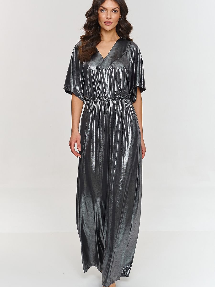 Ten kombinezon to połączenie elegancji i wygody, który z pewnością przyciągnie uwagę na każdej specjalnej okazji. Luźna góra z rękawami w stylu kimono dodają mu lekkości i swobody. Ten detal sprawia, że kreacja wygląda wyjątkowo i stylowo, jednocześnie nie ograniczając ruchów. Dekolt w serek jest subtelny i elegancki, doskonale eksponując szyję i ramiona. Taki krój dekoltu dodaje zmysłowości i podkreśla kobiecą sylwetkę, zachowując przy tym klasyczny, wytworny wygląd. Nogawki o szerokim kroju nadają kombinezonowi lekkości jednocześnie maskując niedoskonałości figury i pozwolą wydłużyć sylwetkę. Elastyczny pas w talii gwarantuje dopasowanie i podkreślenie figury, tworząc efekt wciętej talii. Dzięki temu kombinezon prezentuje się nie tylko stylowo, ale i komfortowo przez cały dzień czy wieczór. Model wykonany jest z delikatnego materiału o metalicznym wykończeniu, nadając stylizacji wyjątkowego blasku i nowoczesnego charakteru. Kombinezon w metalicznej barwie z dekoltem w serek to propozycja, która wyróżni Cię z tłumu. Jego nowoczesny krój i lśniący materiał sprawią, że poczujesz się pewnie i stylowo na każdym przyjęciu. Jest to doskonała alternatywa dla sukienki, gwarantująca wygodę oraz wyjątkowy wygląd.