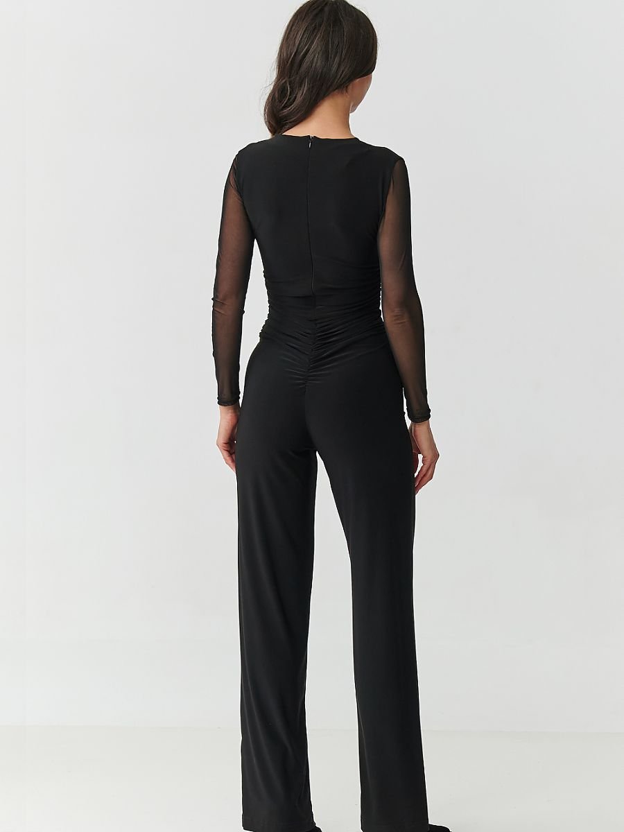 Ten wyjątkowy czarny kombinezon damski to kwintesencja nowoczesnej elegancji. Zaprojektowany z myślą o kobietach, które cenią sobie wygodę, ale nie chcą rezygnować z szyku i klasy, sprawdzi się idealnie na wieczorne wyjście, koktajl party czy elegancką kolację. Góra kombinezonu zachwyca subtelnymi wstawkami z tiulu długie, półprzezroczyste rękawy i dekolt w kształcie litery V nadają całości lekkości i zmysłowości, jednocześnie pozostając eleganckie i stylowe. Dopasowany krój w talii pięknie podkreśla sylwetkę, a szerokie, proste nogawki dodają całości charakteru i optycznie wydłużają nogi. Zapinany na zamek z tyłu, kombinezon gwarantuje wygodę noszenia oraz idealne dopasowanie do figury. To idealna propozycja dla kobiet, które chcą wyróżnić się w tłumie, wybierając stylową alternatywę dla sukienki wieczorowej.