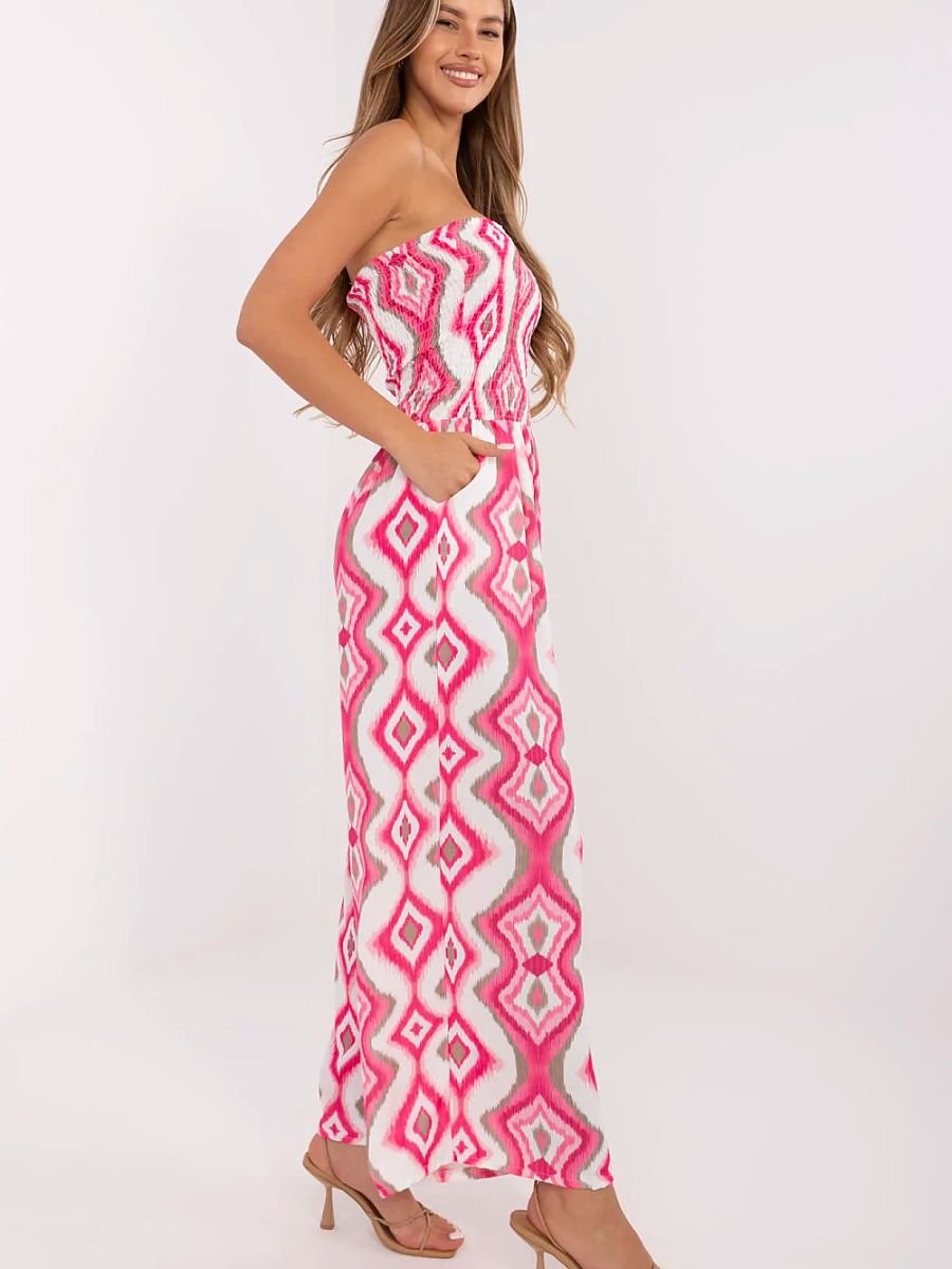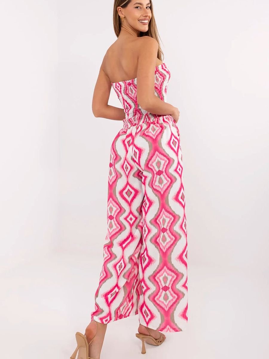 Stylowy i wygodny kombinezon z geometrycznym wzorem to idealna propozycja na co dzień. Wykonany z lekkiej, przewiewnej wiskozy, doskonale sprawdza się w cieplejsze dni, zapewniając komfort i swobodę ruchów. Nowoczesny design łączy w sobie kobiecy styl z miejskim luzem. Model bez rękawów, z prostokątnym dekoltem oraz delikatnymi marszczeniami w górnej części, które dodają objętości i subtelnego uroku. Wszyte usztywniane miseczki zapewniają dobre podtrzymanie biustu i pozwalają nosić kombinezon bez stanika. Brak zapięcia ułatwia zakładanie, wystarczy wsunąć go przez głowę. Długie, szerokie nogawki pięknie się układają i optycznie wydłużają sylwetkę, a praktyczne, wsuwane kieszenie dodają funkcjonalności. To doskonały wybór na codzienne wyjścia, spacery czy spotkania, kiedy chcesz wyglądać modnie, a jednocześnie czuć się swobodnie.
