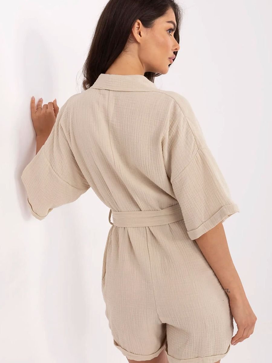 Lekki, muślinowy kombinezon z bawełny to idealna propozycja na codzienne stylizacje w cieplejsze dni. Gładka faktura materiału i naturalna przewiewność bawełny gwarantują komfort noszenia przez cały dzień. Model z krótkim rękawem i klasycznym kołnierzykiem, łączy w sobie swobodę i styl. Zapinany na guziki z przodu, co ułatwia zakładanie i dodaje eleganckiego wykończenia. Kombinezon wyposażony jest w materiałowy pasek do wiązania, który podkreśla talię i nadaje sylwetce kobiecy kształt. Wsuwane kieszenie po bokach zwiększają jego funkcjonalność i wygodę. To praktyczny i stylowy wybór na lato, doskonały zarówno na spacer, zakupy, jak i luźne spotkania ze znajomymi.