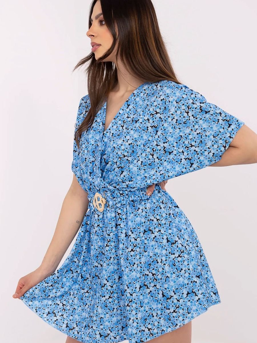 Stylowy kombinezon damski, który łączy wygodę z kobiecym, modnym wyglądem. Wykonany z mieszanki wiskozy, elastanu i poliestru, materiał jest lekki, przyjemny w dotyku i idealny na cieplejsze dni. Kwiatowy wzór nadaje całości świeżości i romantycznego charakteru, sprawiając, że kombinezon wyróżnia się na tle innych. Model o długości mini z krótkim rękawem i kopertowym dekoltem, który pięknie eksponuje szyję i ramiona. Na wierzchu kombinezonu znajduje się spódniczka, która dodaje lekkości i dziewczęcego uroku. Brak zapięcia sprawia, że jest bardzo wygodny, a zapinany pasek w talii umożliwia dopasowanie do sylwetki. Idealny na codzienne stylizacje, łącząc komfort z eleganckim, kobiecym akcentem.