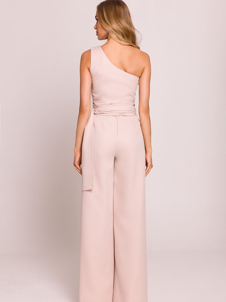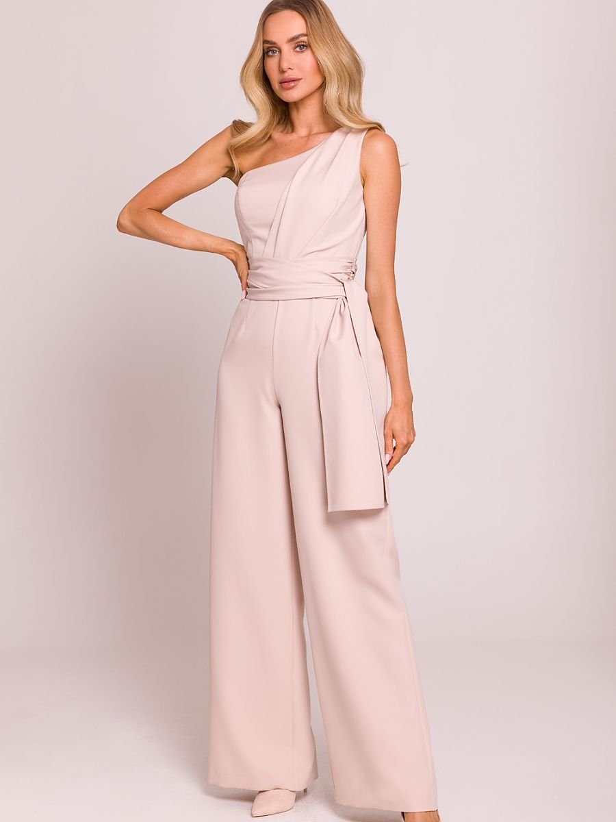 Elegancki, asymetryczny kombinezon z motywem na jedno ramię, który przyciąga wzrok swoją wyjątkową formą. Długie szarfy wszyte do boków nadają mu lekkości i efektownego charakteru, pozwalając na ciekawe stylizowanie. Lekko poszerzone nogawki zapewniają komfort i elegancki wygląd. Model zapinany na kryty zamek z boku, co gwarantuje idealne dopasowanie. Całość zaprojektowana i uszyta w Polsce z najwyższą dbałością o detale, łącząc nowoczesność z klasyką.