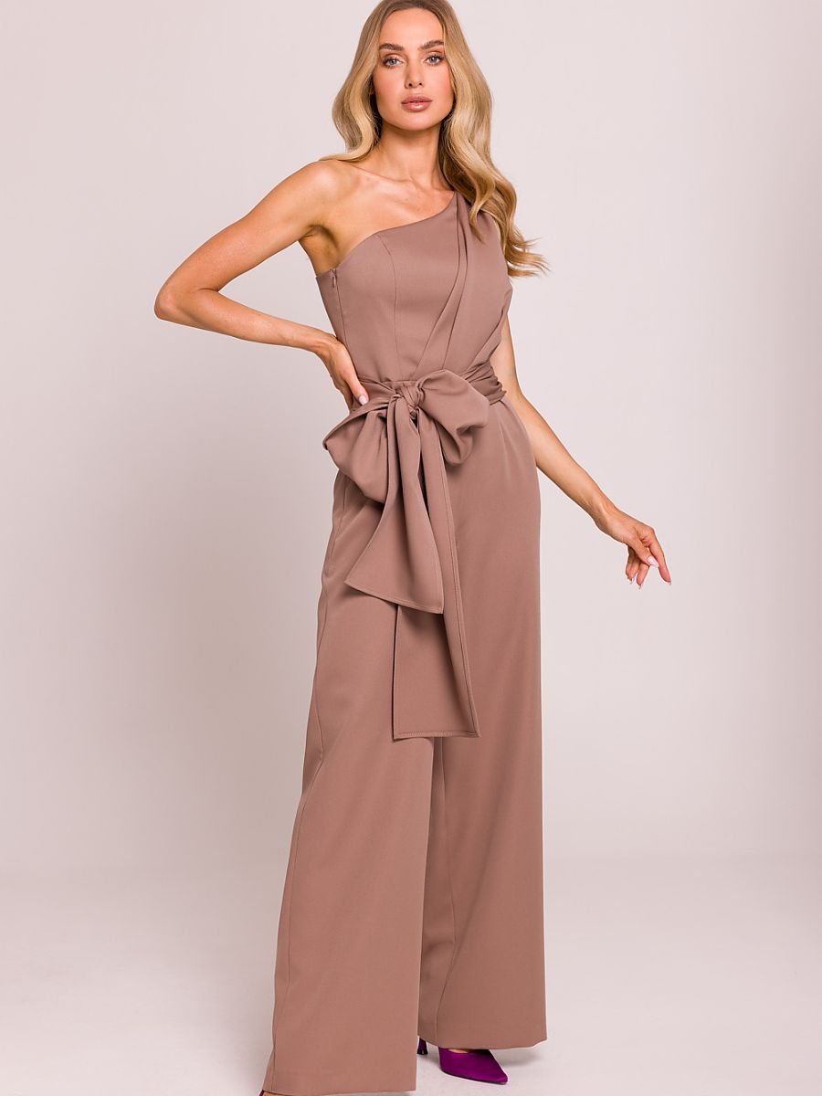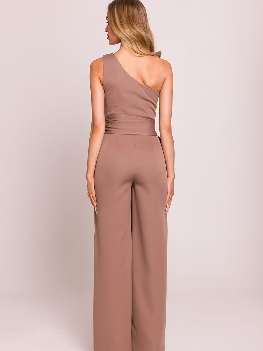 Elegancki, asymetryczny kombinezon z motywem na jedno ramię, który przyciąga wzrok swoją wyjątkową formą. Długie szarfy wszyte do boków nadają mu lekkości i efektownego charakteru, pozwalając na ciekawe stylizowanie. Lekko poszerzone nogawki zapewniają komfort i elegancki wygląd. Model zapinany na kryty zamek z boku, co gwarantuje idealne dopasowanie. Całość zaprojektowana i uszyta w Polsce z najwyższą dbałością o detale, łącząc nowoczesność z klasyką.
