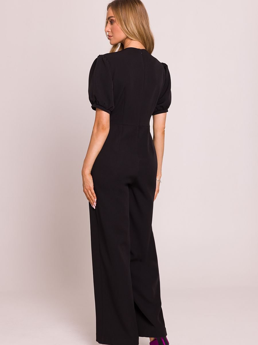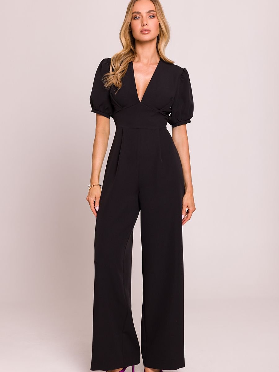 Stylowy kombinezon o kobiecym kroju, wykonany z wysokiej jakości tkaniny. Głęboki dekolt w kształcie litery V pięknie eksponuje szyję i dekolt, a podkreślona talia podkreśla sylwetkę. Krótkie bufiaste rękawy zakończone mankietami dodają romantycznego akcentu, a lekko poszerzone nogawki z zakładkami od talii zapewniają elegancki i swobodny look. Model zapinany na kryty zamek z tyłu, z górą na podszewce dla większego komfortu noszenia. Całość zaprojektowana i uszyta w Polsce z dbałością o każdy detal.