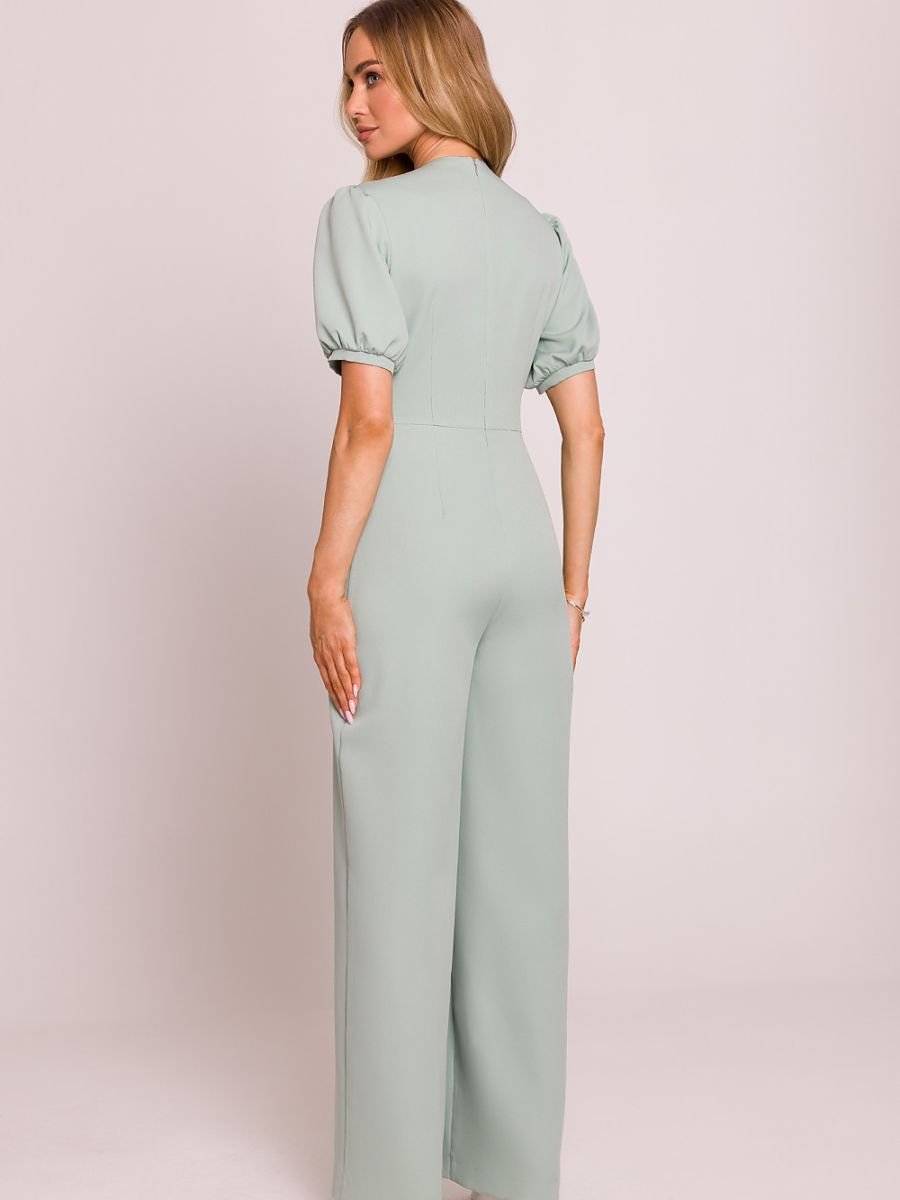 Stylowy kombinezon o kobiecym kroju, wykonany z wysokiej jakości tkaniny. Głęboki dekolt w kształcie litery V pięknie eksponuje szyję i dekolt, a podkreślona talia podkreśla sylwetkę. Krótkie bufiaste rękawy zakończone mankietami dodają romantycznego akcentu, a lekko poszerzone nogawki z zakładkami od talii zapewniają elegancki i swobodny look. Model zapinany na kryty zamek z tyłu, z górą na podszewce dla większego komfortu noszenia. Całość zaprojektowana i uszyta w Polsce z dbałością o każdy detal.