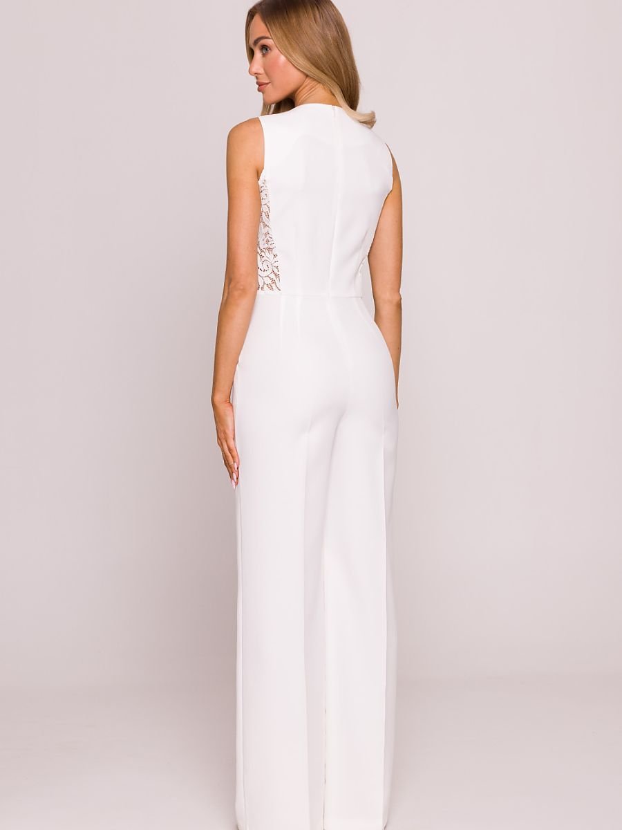 Wyjątkowy kombinezon, który łączy w sobie klasyczną elegancję i subtelną zmysłowość. Wykonany z gładkiej, przyjemnej w dotyku tkaniny, wzbogacony po bokach o geometryczne, koronkowe panele, które pięknie modelują sylwetkę i dodają całości lekkości. Dopasowana góra z zabudowanym, okrągłym dekoltem i bez rękawów kontrastuje z szerokimi, długimi nogawkami zaprasowanymi na kant, tworząc elegancki, wydłużający optycznie nogi fason. Talia została podkreślona metalową ozdobą z przodu, która stanowi minimalistyczny, ale efektowny detal. Z tyłu kryty zamek zapewnia wygodne zakładanie, a brak kieszeni podkreśla czystość formy. Kombinezon doskonale sprawdzi się podczas uroczystości, wieczornych wyjść czy formalnych spotkań. Zaprojektowano i uszyto w Polsce, z dbałością o jakość i detale. Koronka 90% nylon, 10% spandex.