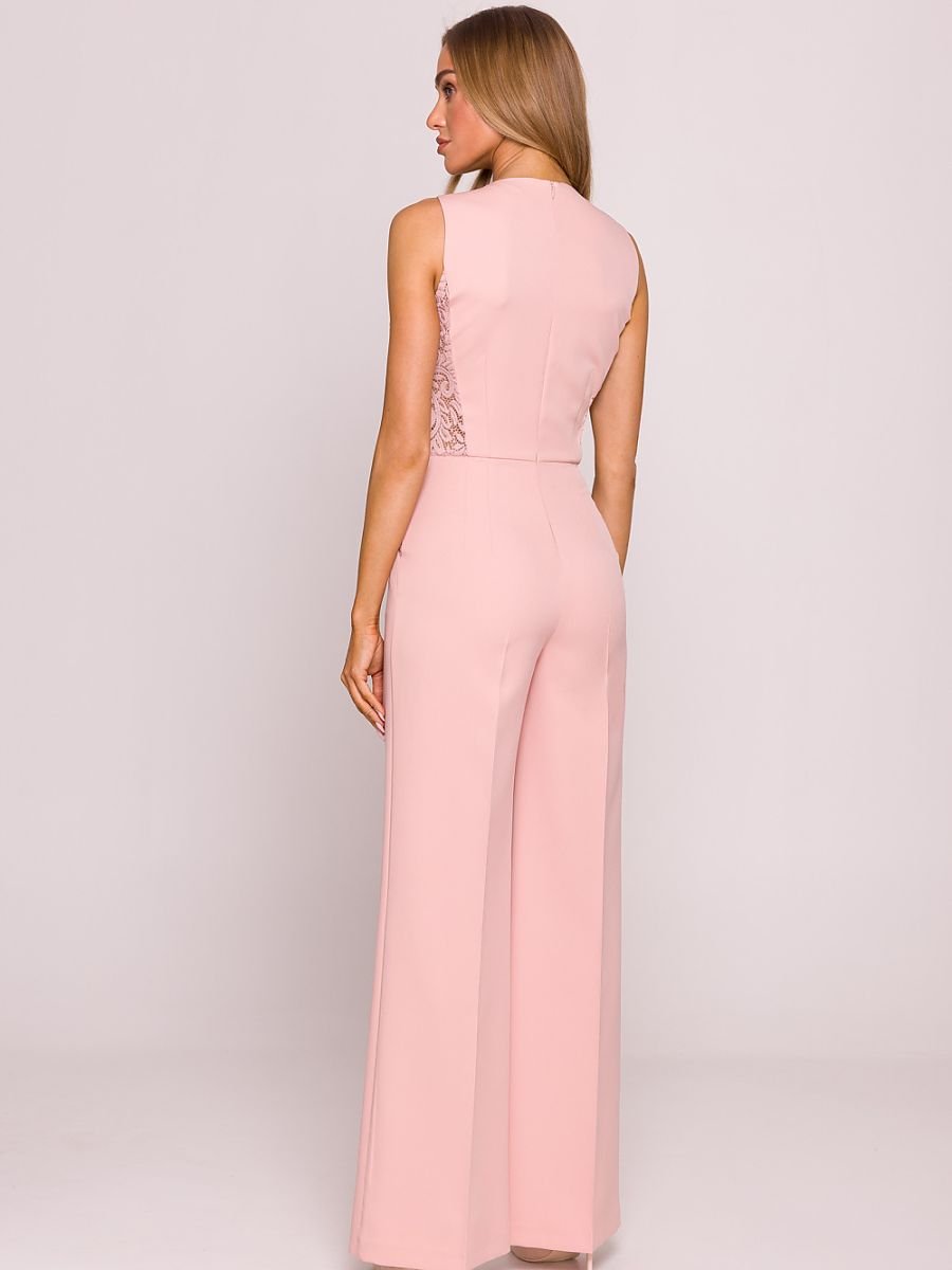 Wyjątkowy kombinezon, który łączy w sobie klasyczną elegancję i subtelną zmysłowość. Wykonany z gładkiej, przyjemnej w dotyku tkaniny, wzbogacony po bokach o geometryczne, koronkowe panele, które pięknie modelują sylwetkę i dodają całości lekkości. Dopasowana góra z zabudowanym, okrągłym dekoltem i bez rękawów kontrastuje z szerokimi, długimi nogawkami zaprasowanymi na kant, tworząc elegancki, wydłużający optycznie nogi fason. Talia została podkreślona metalową ozdobą z przodu, która stanowi minimalistyczny, ale efektowny detal. Z tyłu kryty zamek zapewnia wygodne zakładanie, a brak kieszeni podkreśla czystość formy. Kombinezon doskonale sprawdzi się podczas uroczystości, wieczornych wyjść czy formalnych spotkań. Zaprojektowano i uszyto w Polsce, z dbałością o jakość i detale. Koronka 90% nylon, 10% spandex.