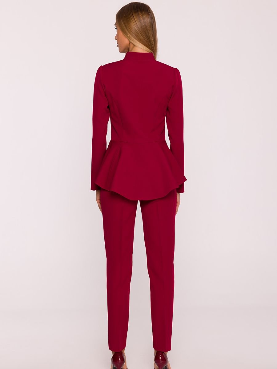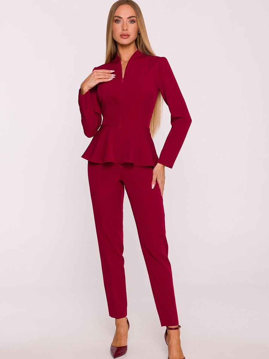 Elegancki kombinezon uszyty z gładkiej tkaniny o matowym wykończeniu to idealne połączenie nowoczesnego stylu i kobiecej formy. Jednoczęściowy fason został zaprojektowany tak, aby subtelnie modelować sylwetkę i podkreślać jej atuty. Dekolt w kształcie litery V z możliwością regulacji głębokości dzięki rozsuwanemu zamkowi dodaje całości zmysłowego charakteru. Długie rękawy wprowadzają nutę klasy, a kryty zamek z przodu gwarantuje wygodę i eleganckie wykończenie. Talia została podkreślona cięciem i efektowną baskinką, która akcentuje wcięcie oraz zakrywa biodra, część pośladków i brzuszek, nadając sylwetce harmonijny kształt. Nogawki o długości do kostek są zwężane ku dołowi, co optycznie wysmukla nogi i dodaje lekkości. Brak kieszeni i podszewki sprawia, że kombinezon pozostaje lekki i komfortowy, a jednocześnie zachowuje elegancki, wyrafinowany wygląd. Zaprojektowany i uszyty w Polsce, stworzony z myślą o kobietach, które chcą czuć się pewnie i wyjątkowo w każdej sytuacji.