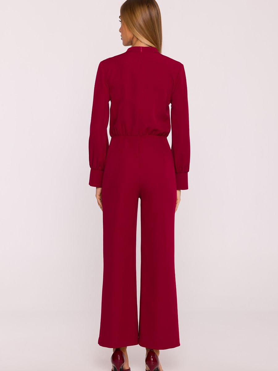 Stylowy kombinezon uszyty z gładkiej tkaniny o matowym wykończeniu to propozycja, która łączy nowoczesny charakter z ponadczasową elegancją. Jednoczęściowa forma pięknie podkreśla sylwetkę, a dopasowana talia i szerokie nogawki 7/8 nadają całości lekkości i swobody. Góra kombinezonu wyróżnia się stójką z delikatnym marszczeniem przy ramieniu, które subtelnie modeluje linię ramion i nadaje wyjątkowego szyku. Długie rękawy zakończono szerokimi mankietami z rozcięciem, podkreślając elegancki charakter projektu. Ozdobne guziki na ramieniu stanowią stylowy detal, dodający całości niepowtarzalności. Model zapinany jest na kryty zamek z tyłu, co zapewnia wygodę zakładania i estetyczne wykończenie. Brak podszewki i kieszeni sprawia, że kombinezon pozostaje lekki, a gładka tkanina pozwala na tworzenie wielu różnorodnych stylizacji, od codziennych po wieczorowe. Zaprojektowany i uszyty w Polsce, stworzony z myślą o kobietach ceniących elegancję, komfort i ponadczasowy design.