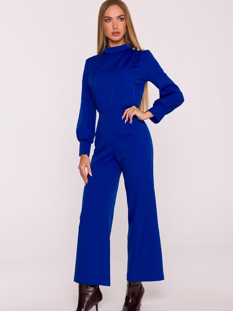 Stylowy kombinezon uszyty z gładkiej tkaniny o matowym wykończeniu to propozycja, która łączy nowoczesny charakter z ponadczasową elegancją. Jednoczęściowa forma pięknie podkreśla sylwetkę, a dopasowana talia i szerokie nogawki 7/8 nadają całości lekkości i swobody. Góra kombinezonu wyróżnia się stójką z delikatnym marszczeniem przy ramieniu, które subtelnie modeluje linię ramion i nadaje wyjątkowego szyku. Długie rękawy zakończono szerokimi mankietami z rozcięciem, podkreślając elegancki charakter projektu. Ozdobne guziki na ramieniu stanowią stylowy detal, dodający całości niepowtarzalności. Model zapinany jest na kryty zamek z tyłu, co zapewnia wygodę zakładania i estetyczne wykończenie. Brak podszewki i kieszeni sprawia, że kombinezon pozostaje lekki, a gładka tkanina pozwala na tworzenie wielu różnorodnych stylizacji, od codziennych po wieczorowe. Zaprojektowany i uszyty w Polsce, stworzony z myślą o kobietach ceniących elegancję, komfort i ponadczasowy design.