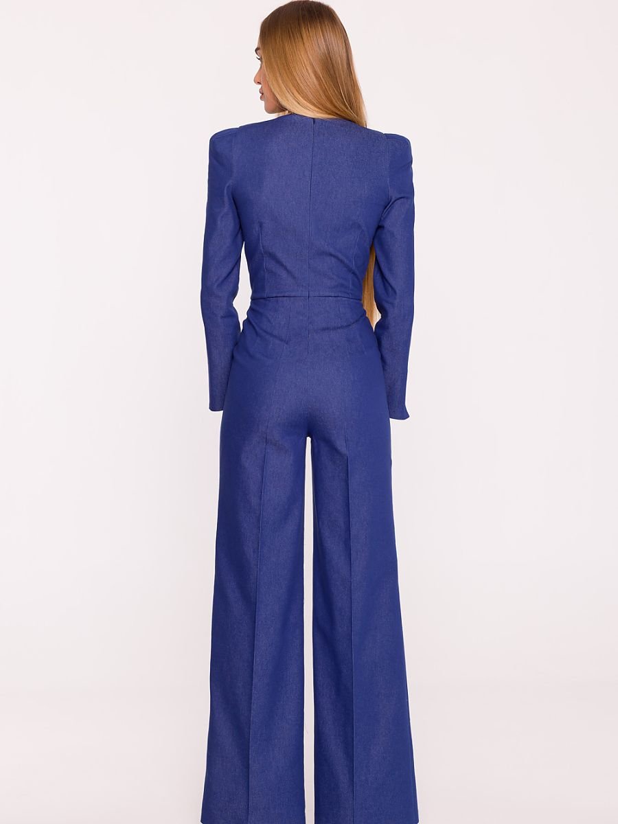 Elegancki kombinezon uszyty z tkaniny imitującej denim to wyjątkowa propozycja łącząca nowoczesny styl z klasyczną formą. Lekko sztywna, matowa i delikatnie elastyczna tkanina pięknie trzyma fason, a podszewka ( 95% poliester, 5% elastan) zapewnia komfort i nienaganne układanie się całości. Model wyróżnia się dekoltem w kształcie litery V, który subtelnie wysmukla szyję i dodaje sylwetce lekkości. Długie rękawy zakończone delikatnym rozkloszowaniem przy mankiecie wprowadzają elegancki, wyrafinowany akcent. Zapięcie na kryty zamek z tyłu sprawia, że całość prezentuje się spójnie i schludnie. Góra kombinezonu ma wyraźnie zarysowaną, strukturalną linię ramion i dopasowaną talię, którą dodatkowo podkreśla metalowy łańcuszek z logo. Szerokie nogawki typu palazzo, sięgające do ziemi, optycznie wydłużają sylwetkę i nadają jej wyważone, wysmuklone proporcje. Zaprojektowany i uszyty w Polsce, stworzony z myślą o kobietach, które cenią nowoczesną elegancję, komfort oraz perfekcyjne wykończenie w każdym detalu.