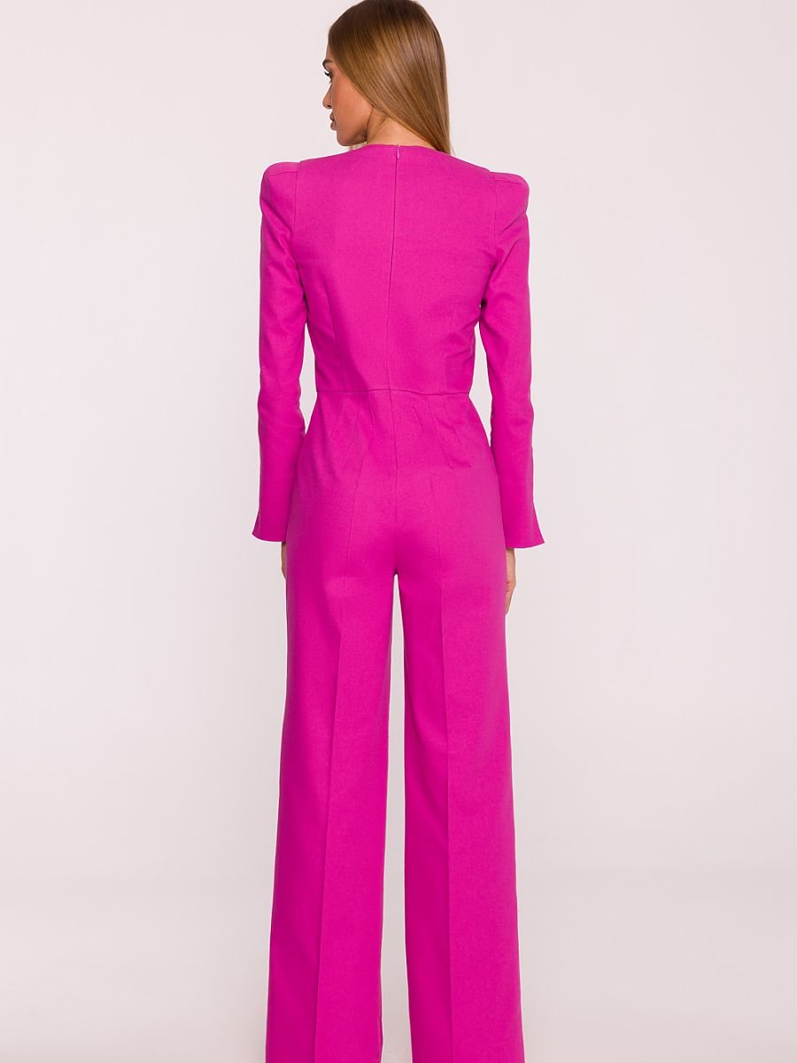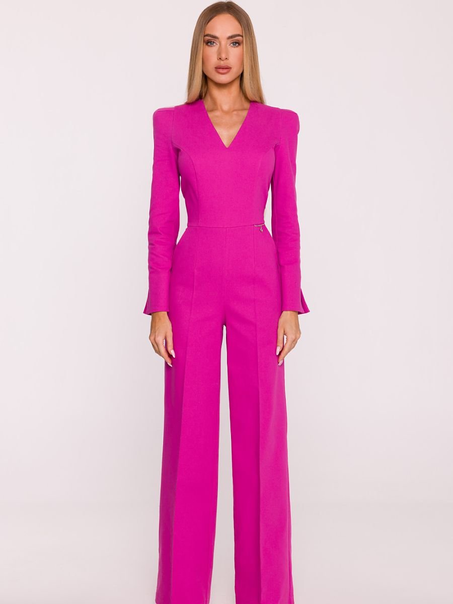 Elegancki kombinezon uszyty z tkaniny imitującej denim to wyjątkowa propozycja łącząca nowoczesny styl z klasyczną formą. Lekko sztywna, matowa i delikatnie elastyczna tkanina pięknie trzyma fason, a podszewka ( 95% poliester, 5% elastan) zapewnia komfort i nienaganne układanie się całości. Model wyróżnia się dekoltem w kształcie litery V, który subtelnie wysmukla szyję i dodaje sylwetce lekkości. Długie rękawy zakończone delikatnym rozkloszowaniem przy mankiecie wprowadzają elegancki, wyrafinowany akcent. Zapięcie na kryty zamek z tyłu sprawia, że całość prezentuje się spójnie i schludnie. Góra kombinezonu ma wyraźnie zarysowaną, strukturalną linię ramion i dopasowaną talię, którą dodatkowo podkreśla metalowy łańcuszek z logo. Szerokie nogawki typu palazzo, sięgające do ziemi, optycznie wydłużają sylwetkę i nadają jej wyważone, wysmuklone proporcje. Zaprojektowany i uszyty w Polsce, stworzony z myślą o kobietach, które cenią nowoczesną elegancję, komfort oraz perfekcyjne wykończenie w każdym detalu.