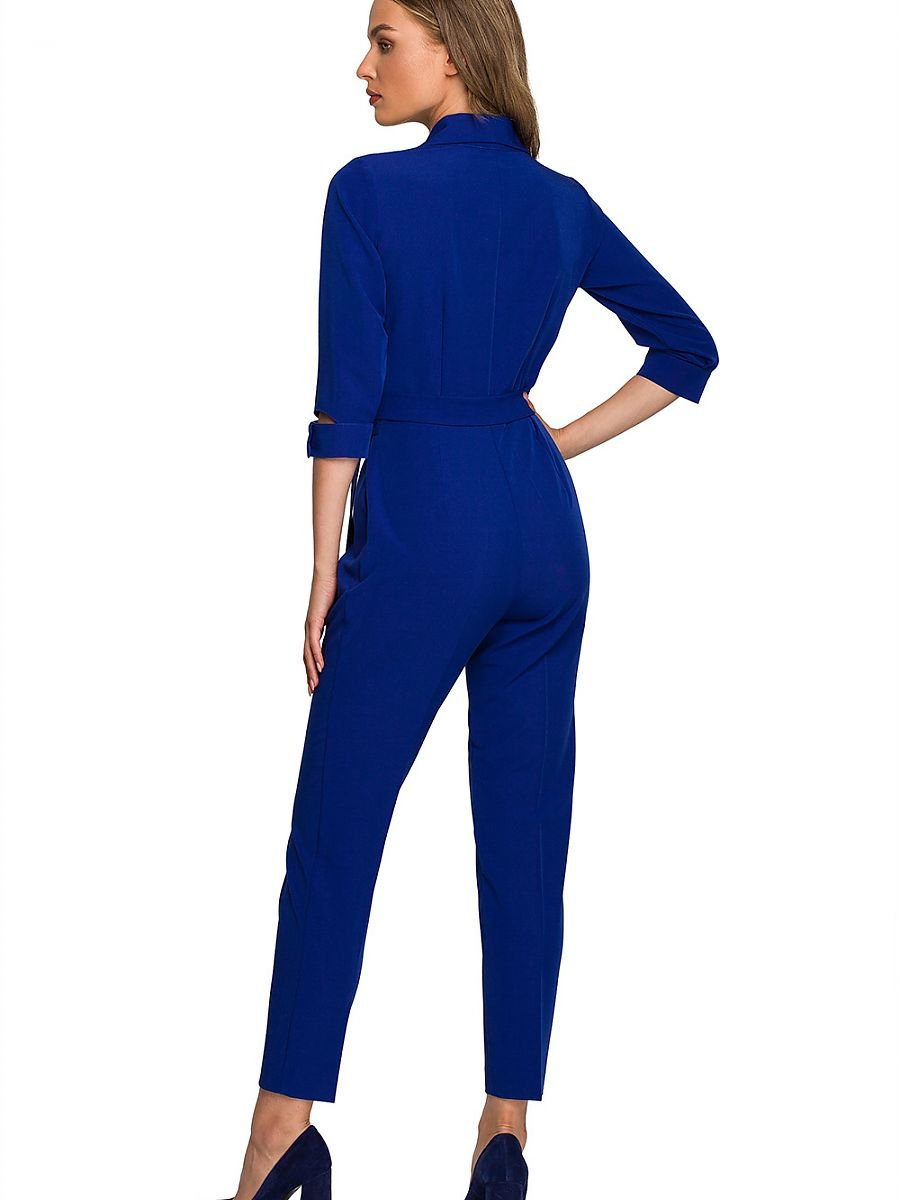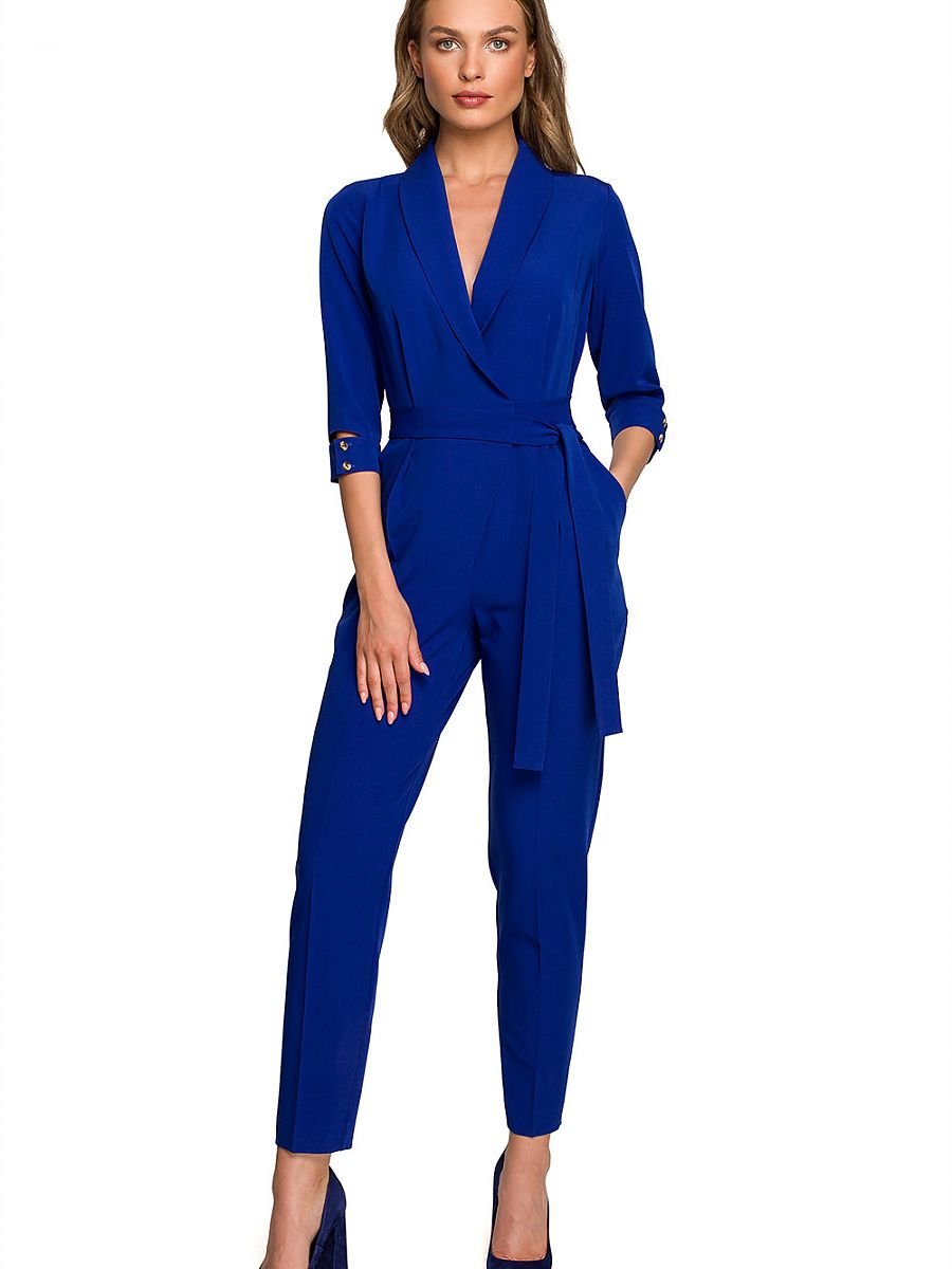 Ten kombinezon nie jedno ma oblicze. Góra z dekoltem kopertowym i szalowym kołnierzem, rękawy długości 7/8 z ozdobnymi pęknięciami, wiązanie w talii i wąskie nogawki zaprasowane na kant, to biurowy szyk albo wyjściowy szał. Kombinezon bez podszewki.