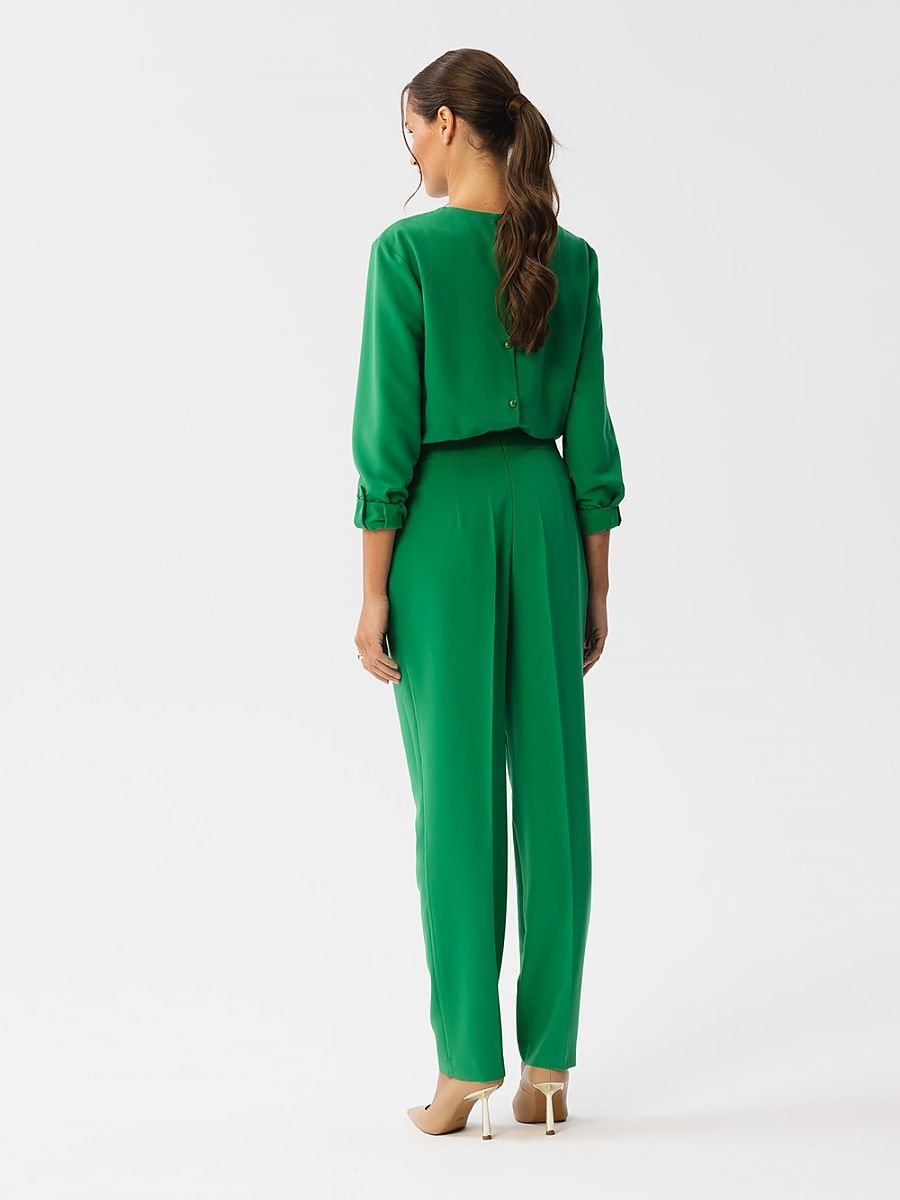 Przedstawiamy wyjątkowy jednoczęściowy kombinezon, który łączy w sobie styl i wygodę. Dekolt kombinezonu ozdobiony jest efektownym rozcięciem, dodając nutkę subtelności. Marszczenie w talii podkreśla sylwetkę i nadaje kombinezonowi elegancji. Z tyłu znajduje się zapięcie na guziki oraz kryty zamek, który biegnie od talii w dół. Długie rękawy z mankietami i podpięciem pozwalającym regulować długość dodają wyjątkowego charakteru. Nogawki są długie i zaprasowane na kant, co dodaje kombinezonowi szyku. Boczne kieszenie są zarówno praktyczne, jak i stylowe. Kombinezon nie posiada podszewki, co sprawia, że jest lekki i komfortowy w noszeniu. To doskonały wybór na wiele okazji, od formalnych spotkań po bardziej relaksujące wydarzenia, pozwalając Ci wyróżnić się i czuć się wyjątkowo.