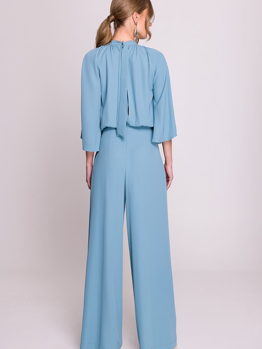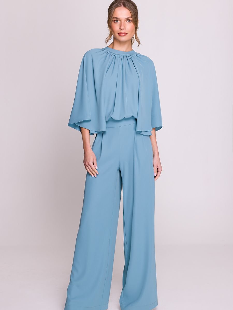 Elegancki i wyrafinowany kombinezon, który łączy styl i wygodę w perfekcyjnej harmonii. Góra delikatnie marszczona, z szerokimi kimonowymi rękawami, nadaje mu lekkości i subtelnej objętości. Dekolt ze stójką wiązaną z tyłu długimi szarfami pozwala na regulację dopasowania, a rozcięcie na plecach można dowolnie otwierać lub zamykać, dostosowując je do własnych preferencji. Szerokie, luźno opadające nogawki dodają elegancji i swobody ruchu, a boczne kieszenie zapewniają funkcjonalność. Model zapinany na kryty zamek z tyłu, co podkreśla jego estetyczne wykończenie. Zaprojektowany i uszyty w Polsce, z najwyższą dbałością o detale. Idealny na wyjątkowe okazje i stylowe wyjścia. Długość w tabelce dotyczy długości nogawki.