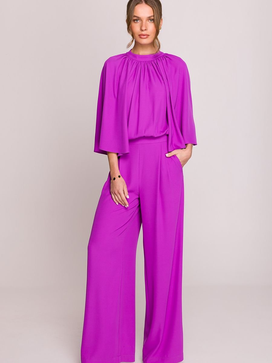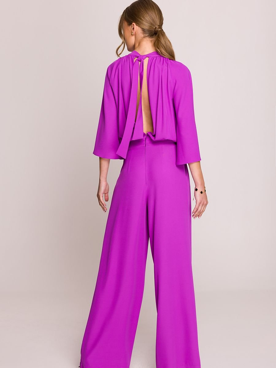 Elegancki i wyrafinowany kombinezon, który łączy styl i wygodę w perfekcyjnej harmonii. Góra delikatnie marszczona, z szerokimi kimonowymi rękawami, nadaje mu lekkości i subtelnej objętości. Dekolt ze stójką wiązaną z tyłu długimi szarfami pozwala na regulację dopasowania, a rozcięcie na plecach można dowolnie otwierać lub zamykać, dostosowując je do własnych preferencji. Szerokie, luźno opadające nogawki dodają elegancji i swobody ruchu, a boczne kieszenie zapewniają funkcjonalność. Model zapinany na kryty zamek z tyłu, co podkreśla jego estetyczne wykończenie. Zaprojektowany i uszyty w Polsce, z najwyższą dbałością o detale. Idealny na wyjątkowe okazje i stylowe wyjścia. Długość w tabelce dotyczy długości nogawki.